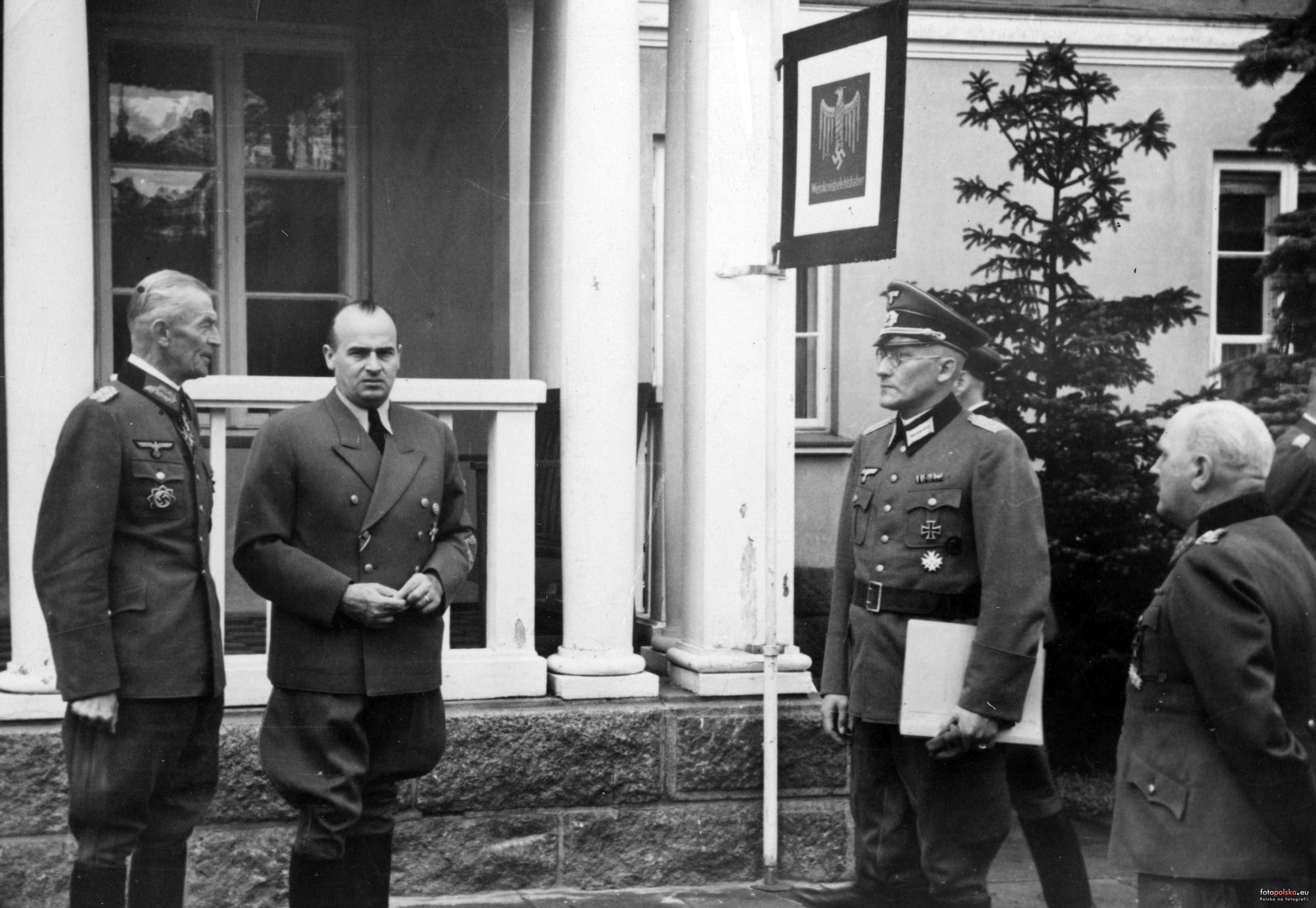 lipiec 1943 , Scena przy wejściu do pałacu myśliwskiego. Wizyta gubernatora Hansa Franka w Spale. Obok Hansa Franka po lewej stronie stoi gospodarz rezydencji, generał piechoty Siegfried Haenicke. Widoczny napis Wehrkreisbefehlshaber - Dowódca Okręgu Wojskowego.Skomentuj zdjęcie |
