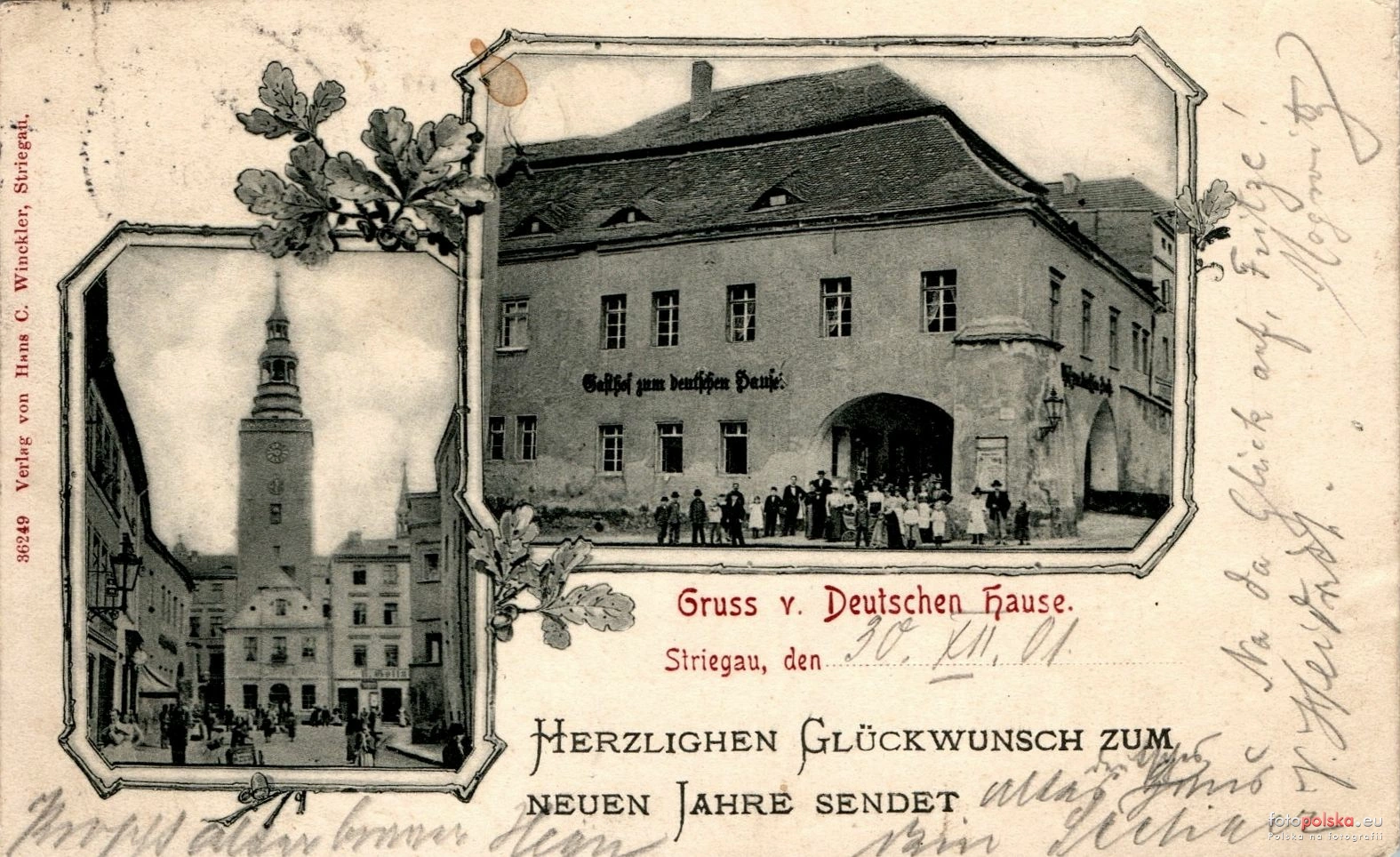 1901 , Strzegom, gospoda zum Deutschen Hause w Rynku i Wieża Targowa. |