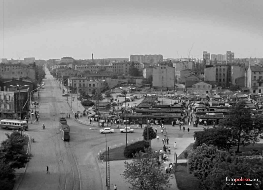 1974 , Bałucki Rynek i skrzyżowanie ulic Zgierskiej/Limanowskiego/Bałucki Rynek. Fot. kadr z filmu "Relacje reporterskie - 1974 r.".Skomentuj zdjęcie