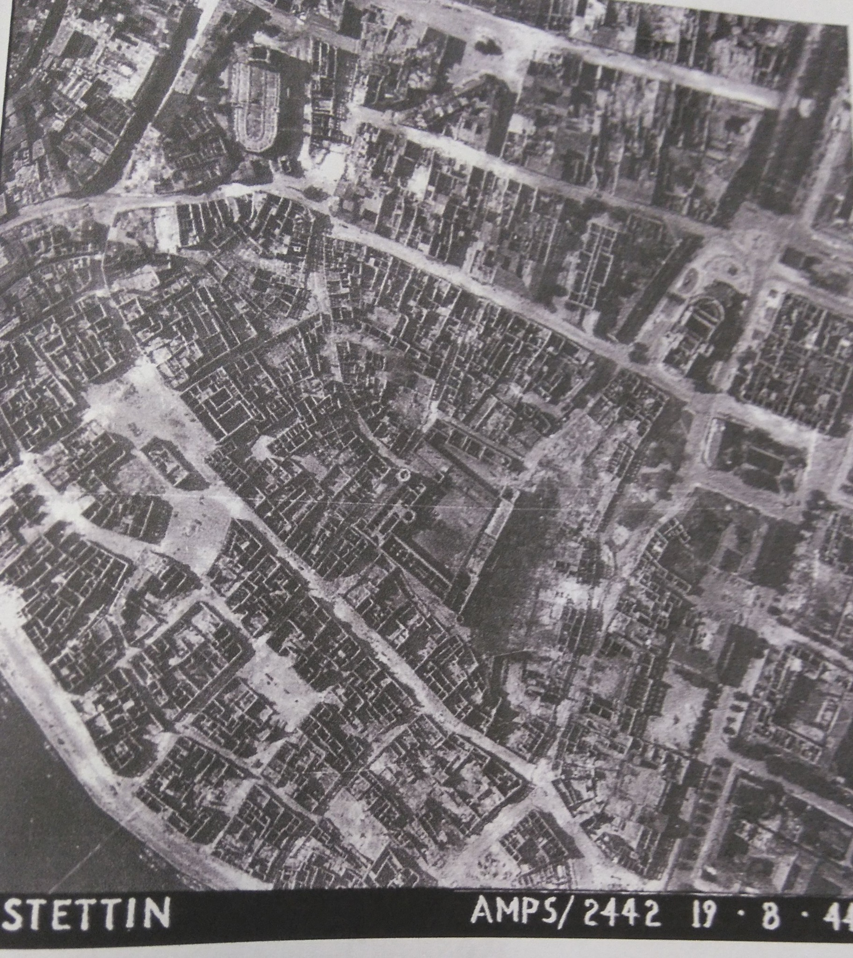 1944 , Zdjęcie lotnicze zniszczeń na Starym Mieście po bombardowaniach alianckich. Źródło: udostępnione przez dr Arkadiusza Małeckiego na Facebooku, jako źródło podano pracę doktorską Małgorzaty Gwiazdowskiej.Skomentuj zdjęcie |