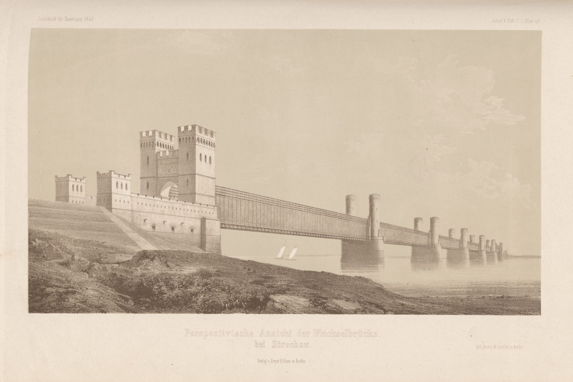 1855 , Widok mostu z Zeitschrift für Bauwesen 1855. Grafika była potem wielokrotnie reprodukowana, tutaj chyba w najlepszej jakości na fp