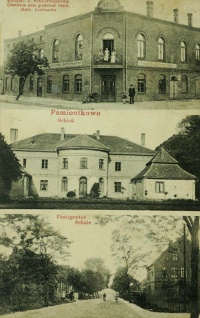 1910 , Na zdjęciach od góry: narożna kamienica ze sklepemi i gospodą, pałac, ulica z budynkami szkoły i pocztySkomentuj zdjęcie |