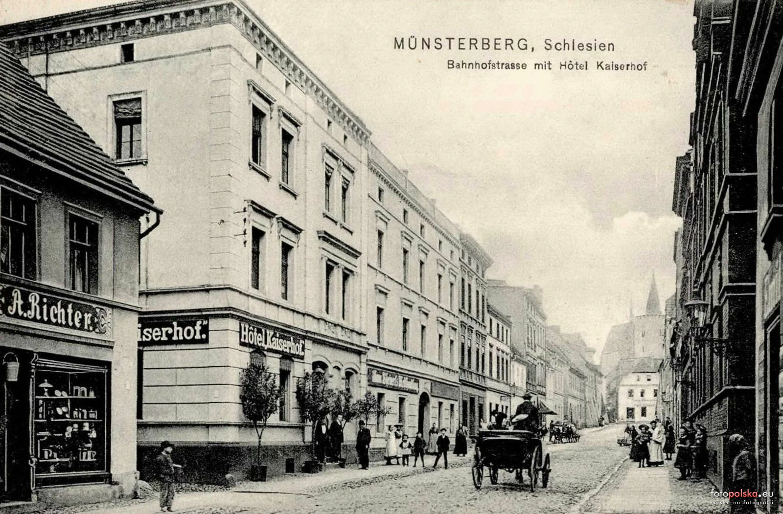 Lata 1905-1906 , Ziębice, ówczesny Münsterberg. Ulica Kolejowa z hotelem Kaiserhof w narożnej kamienicy nr 18. |
