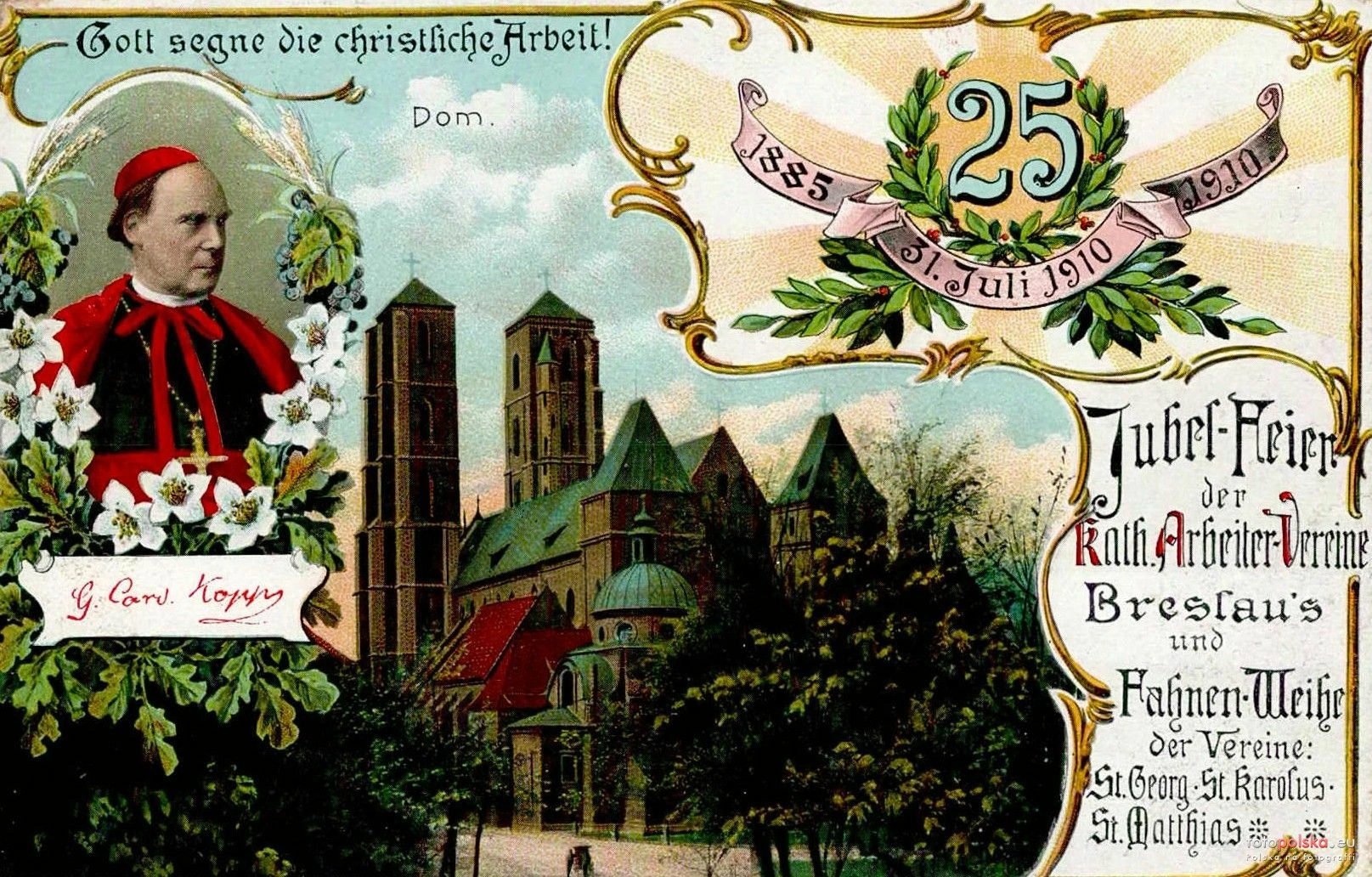 31 lipca 1910 , Wrocławska katedra św. Jana Chrzciciela, na widokówce wydanej z okazji obchodów jubileuszu 25-lecia katolickich stowarzyszeń robotniczych Wrocławia (25 Jubel-Feier der Katolischen Arbeiter-Vereine Breslau’s) oraz uroczystości poświęcenia sztandarów stowarzyszeń św. Jerzego, św. Karola i św. Macieja. Nad wszystkim czuwa kardynał Georg von Kopp. |