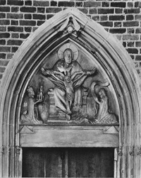 Wewnątrz górnego kościoła zachował się tympanon fundacyjny z przedstawieniem Trójcy Świętej w typie Tronu Łaski adorowanego przez Henryka Probusa i jego żonę Matyldę. Tympanon umieszczony został ok. 1350 r., tj. w momencie ukończenia budowy świątyni, ideowym wzorem zaś była tu soteriologia św. Pawła, według którego w dziele zbawienia główna inicjatywa należy do Boga Ojca, który ustanawia plan pojednania i działa przez Syna. Klęczące postacie ludzi miały natomiast wyrażać nastrój pokuty i potrzeby pomocy oraz być znakiem szacunku, wdzięczności i uwielbienia.