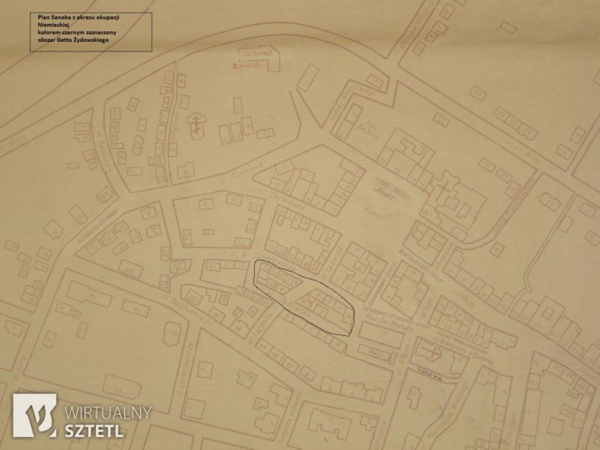 Lata 1940-1942 , Niemiecka mapa Sanoka z zaznaczonym obszarem gettaSkomentuj zdjęcie |