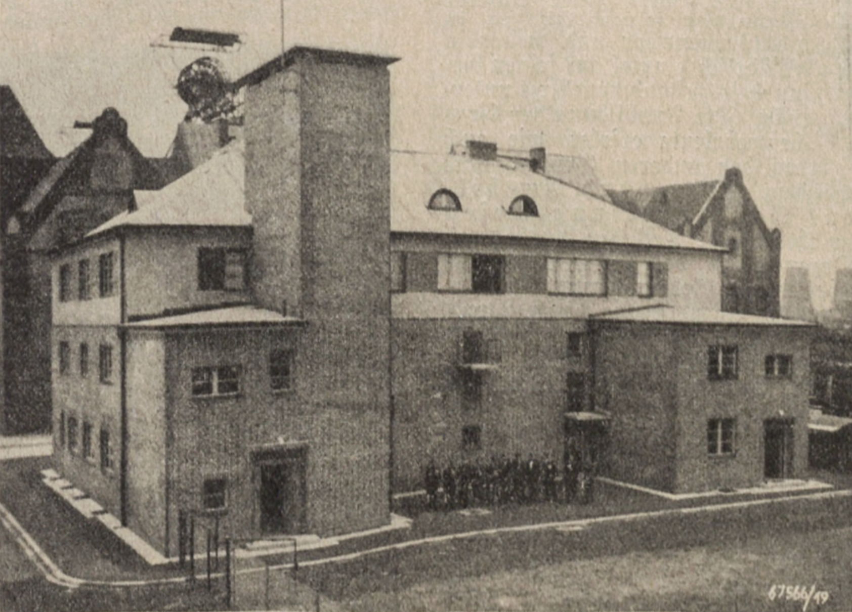 1935 , Nowo wybudowany gmach kopalnianej stacji ratownictwa górniczego (Grubenrettungsgebäude) z wieżą o wysokości 14 metrów, widok od strony tylnej (południowej). W tle szyb „Gräfin Johanna” [„Bolesław”] – 1935 r.Skomentuj zdjęcie |