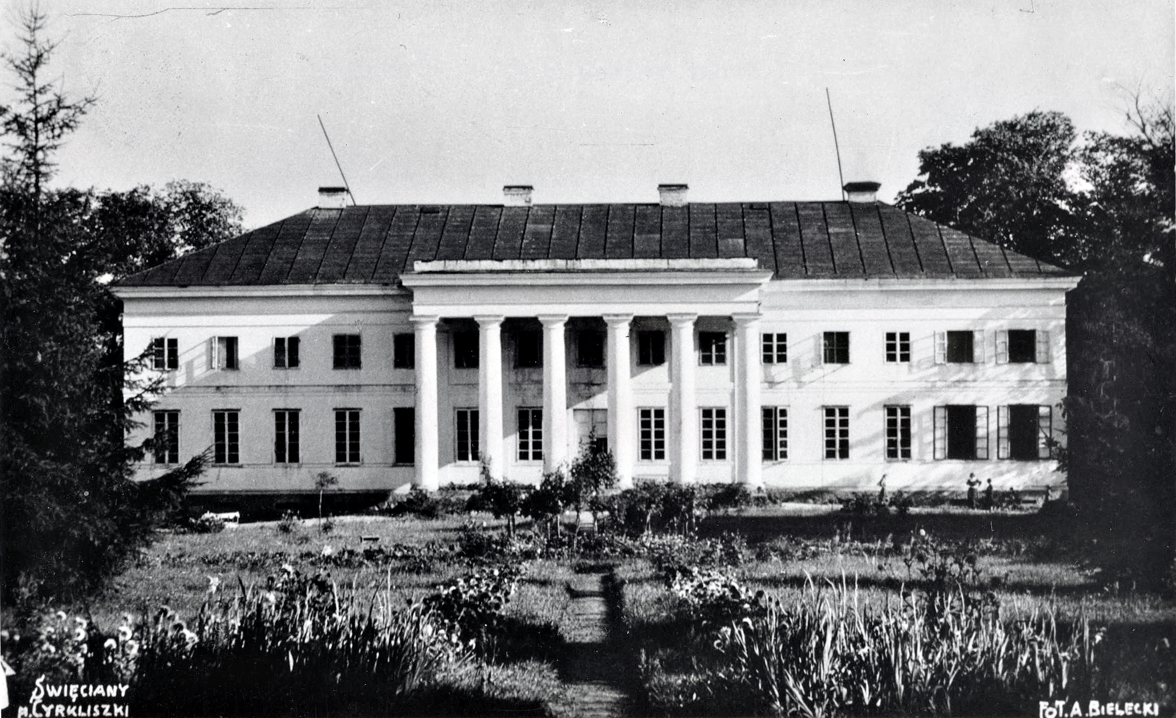 1939 , Parterowy pałacyk został wzniesiony po 1830 r. w stylu późnego klasycyzmu – empire. Od frontu ryzalit z kolumnadą podtrzymującą tympanon. Wokół obiektu, na pofałdowanym terenie, powstał park krajobrazowy z dwiema sadzawkami.Skomentuj zdjęcie |