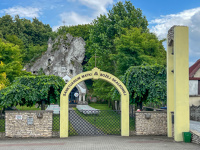 Sanktuarium Matki Bożej Skałkowej więcej zdjęć (11) Sanktuarium Matki Bożej Skałkowej znajduje się przy drodze prowadzącej z Ogrodzieńca do Pilicy w miejscowości Podzamcze, w odległości około 2 kilometrów od Ogrodzieńca. Kult Matki Bożej Skałkowej rozpoczął się w tym miejscu już w 1818 roku. Historia przedstawia wydarzenie, które zapoczątkowało istniejącą do dzisiaj wiarę, w to że jest to miejsce święte. Dnia 14 października 1818 roku mieszkańcowi Podzamcza ukazał się na skale wizerunek Matki Bożej. Po tym wydarzeniu, na skale, w miejscu ukazania się wizerunku Matki Bożej umieszczono obraz Najświętszej Maryi Dziewicy, a mieszkańcy codziennie wchodząc po drabinie zapalali światło przed obrazem. Obraz ten miał być z zamkowej kaplicy przeniesiony do kościoła, jednak to miejsce upodobała sobie Matka Zbawiciela, więc z wielką procesją z kościoła przeniesiono obraz w miejsce objawienia. W miejscu tym było kiedyś źródełko, do którego przychodzili obmywać się chorzy ludzie, gdyż miało ono leczniczą moc. W pięćdziesiątych latach mieszkańcy Podzamcza zbudowali na Skałce niedużą kaplicę ze skalniaków i z lekkiej stalowej konstrukcji. Do 1999 r. w każde niedzielne popołudnie w okresie wiosenno-letnim odprawiano w niej msze święte. W marcu 2000 roku została ona rozebrana, aby na jej miejsce postawić większa i piękniejsza kaplicę z zakrystią. Nowa kaplica zaprojektowana przez architekta mgr inż. Marka Tonderę wraz z figurą Matki Bożej, została uroczyście poświęcona przez J. Eks. Ks. Bp Adama Śmigielskiego, głównego celebranta liturgii Mszy Świętej, w dniu 12 czerwca 2000 roku. Wejście na plac Sanktuarium zdobi kamienny łuk z bramą, a także piękna dzwonnicą. W maju 2004 r. na placu sanktuaryjnym ustawionych zostało pięć stacji różańcowych obrazujących najważniejsze wydarzenia z życia Jezusa Chrystusa. Fundatorami tych stacji są parafianie z Ogrodzieńca i Podzamcza. W sanktuarium znajduje się też historyczny krzyż. Był on wykonany w Cementowni „Wiek” w latach 50 – tych w warunkach konspiracyjnych. Sanktuarium Matki Bożej Skałkowej jest odzwierciedleniem nowoczesnej architektury i sztuki, a wraz z otaczającą ją przyrodą niewątpliwie zachwyca każdego. W sposób naturalny harmonizuje z otaczającym krajobrazem ruin zamku. Jest to miejscem nadzwyczajne, urzekające swym pięknem, napawające ciszą i spokojem. Na podst. www.ogrodzieniec.pl |