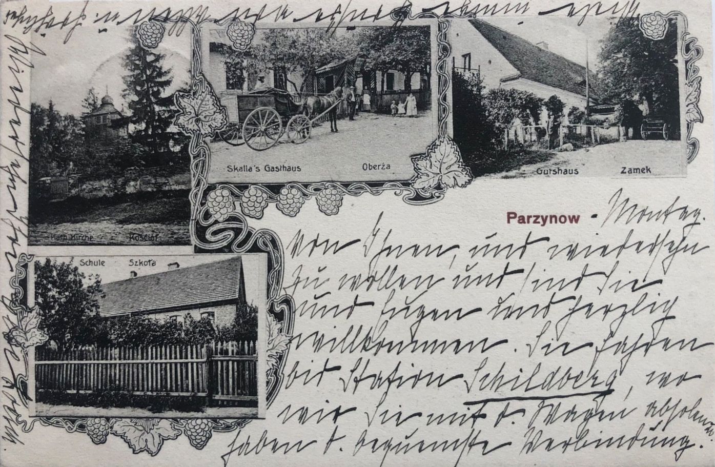 1907 , Parzynów - kościół, oberża, dwór, szkoła. |