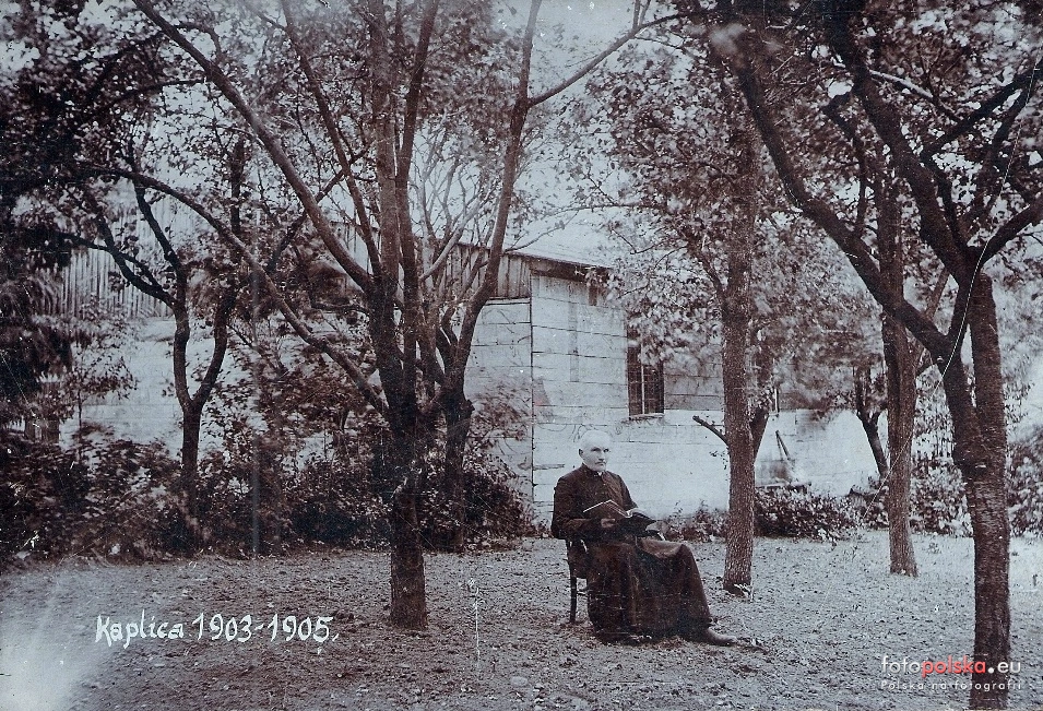 Lata 1903-1905 , Ks. proboszcz Jan Batke na tle kaplicy w Radomnie.Skomentuj zdjęcie |