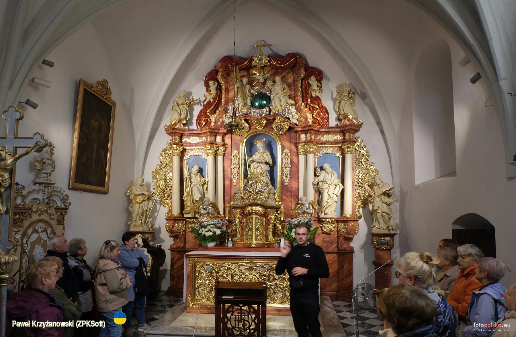 27 września 2025 , Kościół parafialny św. Jakuba Apostoła, wzmiankowany w 1335 r., obecny gotycki wzniesiony w XV w., gruntownie zbarokizowany w 1725 r., restaurowany w XIX w. i w 1960 r. Wnętrze w większości z wyposażeniem barokowym z XVIII w. Na zdjęciu odnawiany ołtarz główny, bogato zdobiony, z licznymi figurami świętych. Centralne miejsce zajmuje figura patrona świątyni - św. Jakuba.Skomentuj zdjęcie |