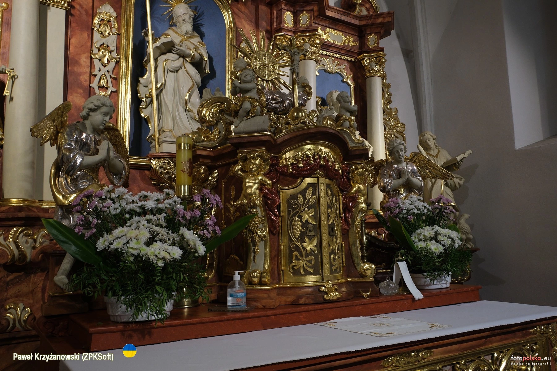 27 września 2025 , Kościół parafialny św. Jakuba Apostoła, wzmiankowany w 1335 r., obecny gotycki wzniesiony w XV w., gruntownie zbarokizowany w 1725 r., restaurowany w XIX w. i w 1960 r. Wnętrze w większości z wyposażeniem barokowym z XVIII w. Na zdjęciu tabernakulum w odnawianym ołtarzu głównym.Skomentuj zdjęcie |