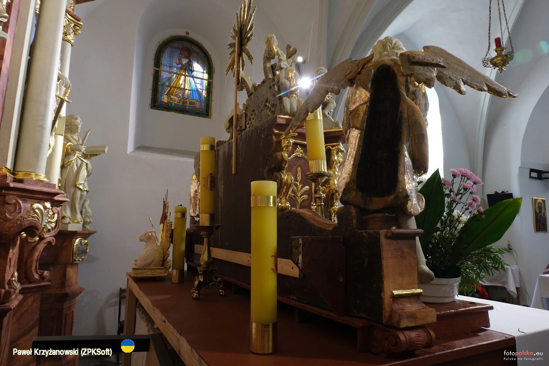 27 września 2025 , Kościół parafialny św. Jakuba Apostoła, wzmiankowany w 1335 r., obecny gotycki wzniesiony w XV w., gruntownie zbarokizowany w 1725 r., restaurowany w XIX w. i w 1960 r. Wnętrze w większości z wyposażeniem barokowym z XVIII w. Na zdjęciu odnawiany ołtarz główny, widziany niejako od środka.Skomentuj zdjęcie |
