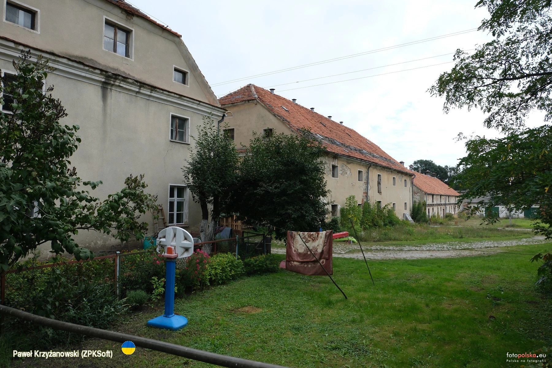 27 września 2025 , Teren dawnego folwarku od strony północno zachodniej. Po II wojnie światowej całość wraz z pałacem należała do PGR. Obecnie w części obiekty prywatne w części - ruina.Skomentuj zdjęcie |
