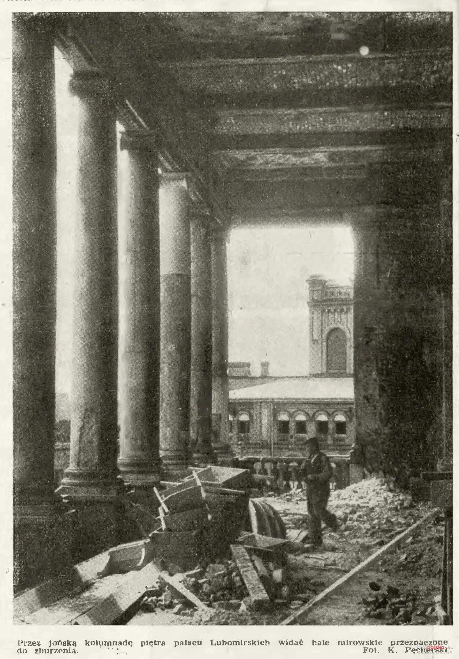 Lata 1947-1948 , Kolumnada pałacu. Źródło: Stolica : warszawski tygodnik ilustrowany. R. 3, 1948 nr 33 (15 VIII)