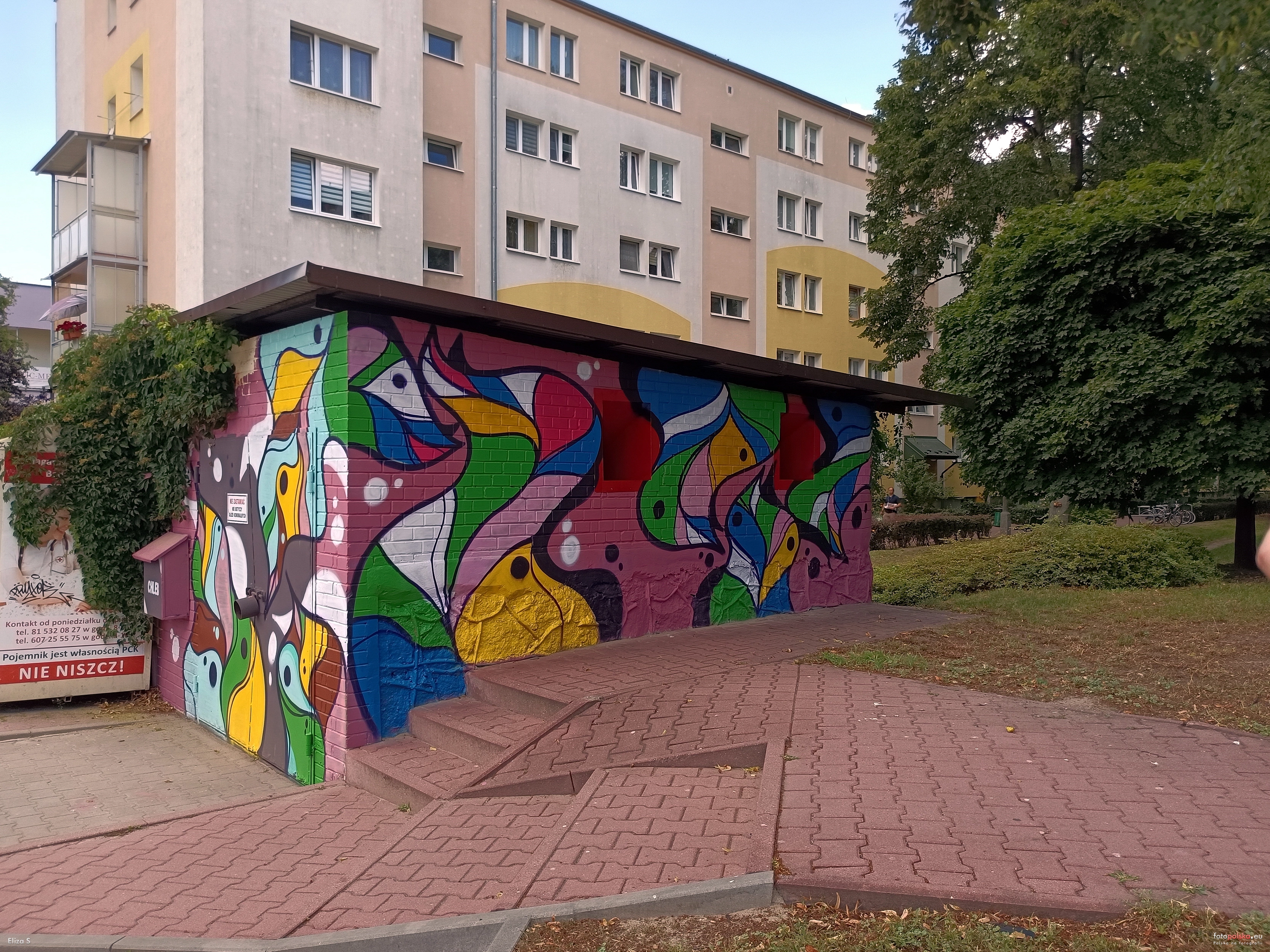 4 lipca 2024 , Wiata śmietnikowa z muralem przy ul. Stanisława Eustachiewicza w sąsiedztiw bloku mieszkalnego ul. Eustachiewicza 7. W tle fragment bloku mieszkalnego ul. Eustachiewicza 5.Skomentuj zdjęcie |