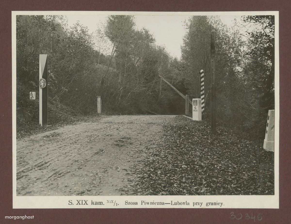 Lata 1920-1930 , Słupy graniczne i szlaban na drodze Piwniczna-Lubovla przy granicy polsko-czechosłowackiejSkomentuj zdjęcie