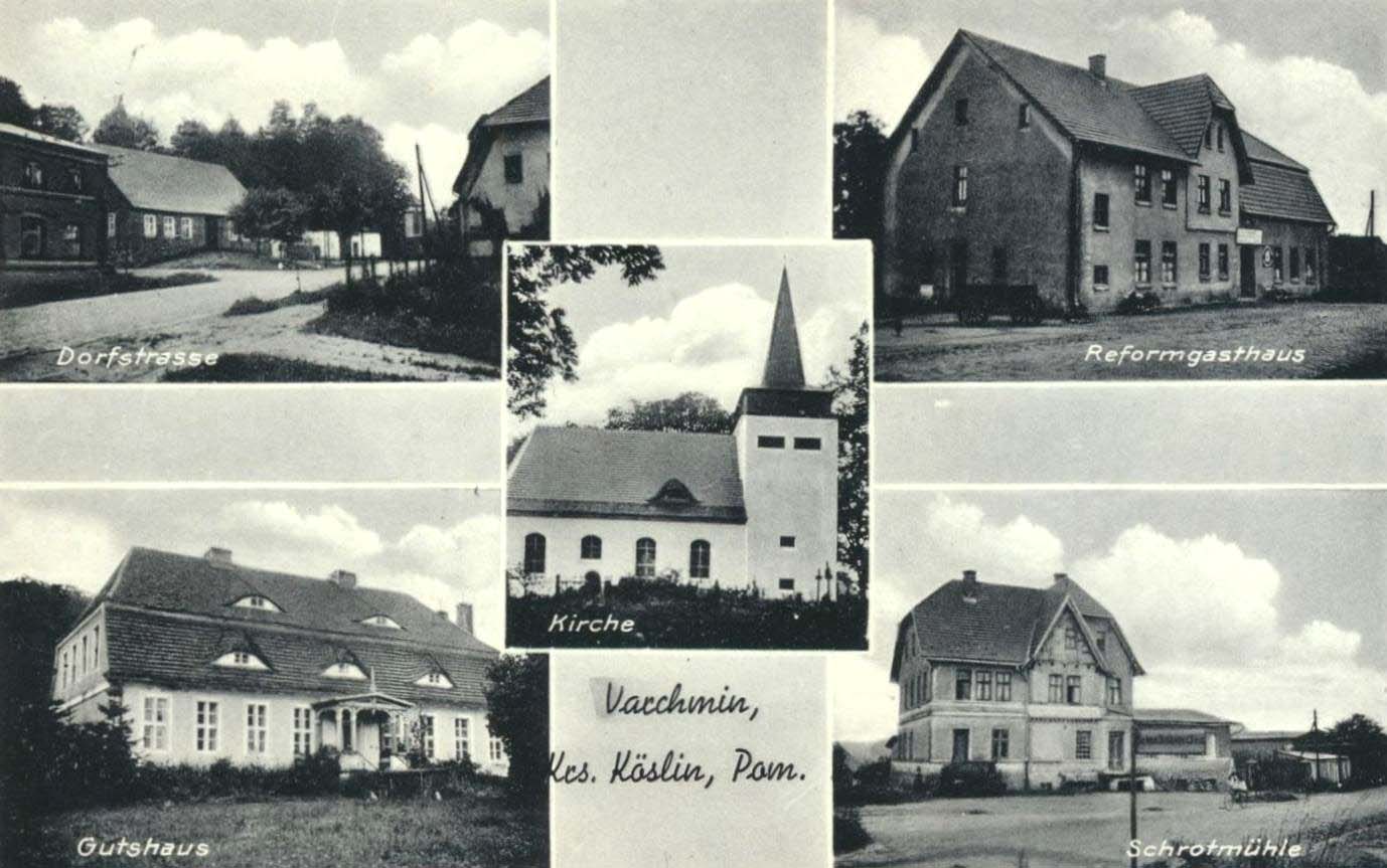 Lata 1934-1938 , Na zdjęciach górnych: droga przez wieś i gospoda, na dolnych: dworek w majątku ziemskim oraz młyn, pośrodku kościółSkomentuj zdjęcie |