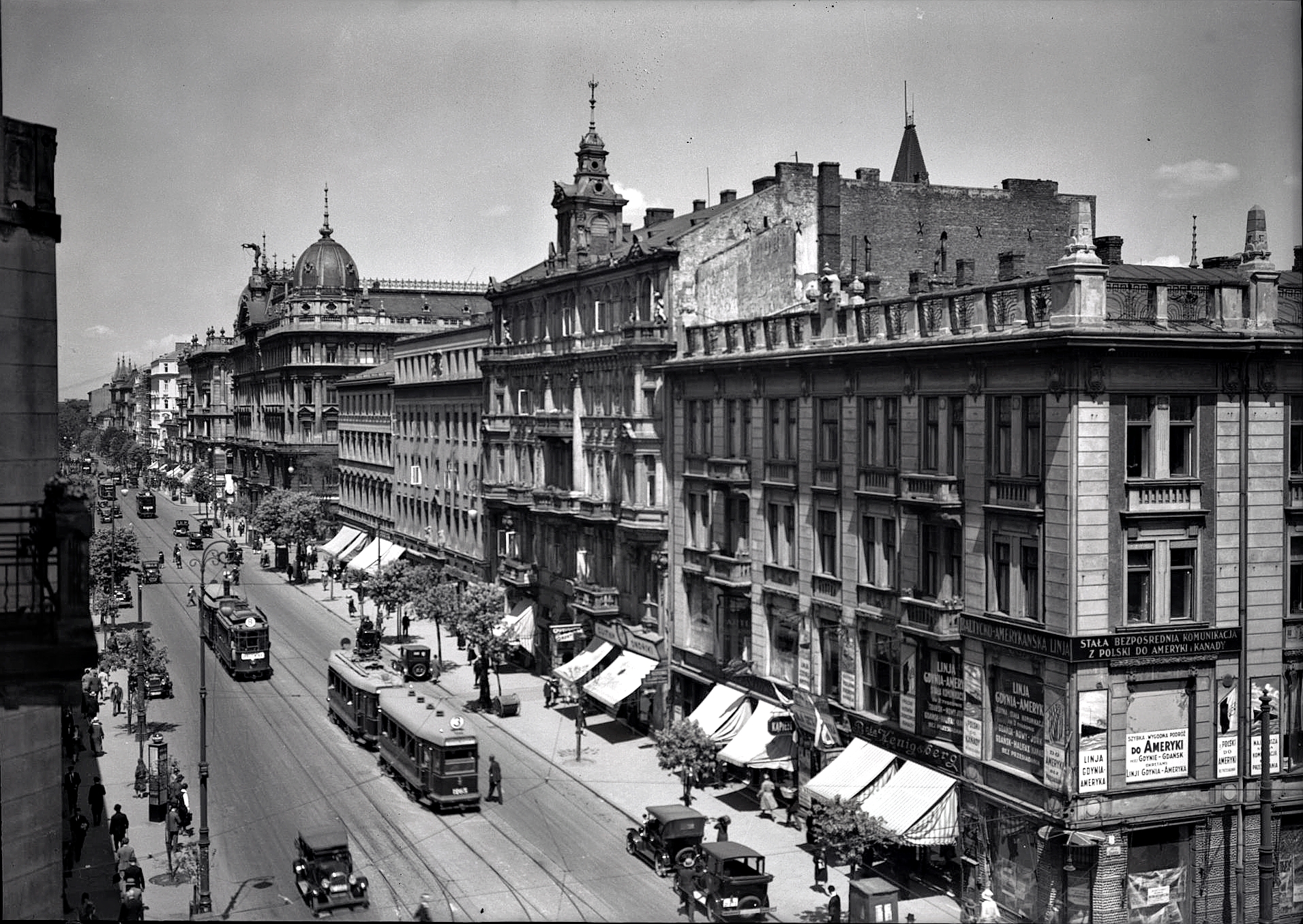4 pobrania 228 odsłon 6 średnia ocen Poprzednie i następne zdjęcia Wiesław Smyk Obiekty widoczne na zdjęciu Marszałkowska 116 - Złota 10 więcej zdjęć (17) Zbudowano: pocz. XX w. Zlikwidowano: II w. ś. Kamienica w narożniku ulic Marszałkowskiej i Złotej wybudowana na przełomie XIX i XX wieku na miejscu dwupiętrowej kamienicy powstałej w latach 1861-62. Budynek uległ zniszczeniu w czasie II wojny światowej. ul. Marszałkowska więcej zdjęć (6869) Nazwa ulicy pochodzi od nazwy urzędu marszałka wielkiego koronnego Franciszka Bielińskiego[1], który bardzo zasłużył się osiemnastowiecznej Warszawie, a którego pałac stał przy historycznym początku ulicy, skrzyżowaniu z ul. Królewską. Fragment przy Ogrodzie Saskim przeprowadzono dopiero w okresie międzywojennym. Towarzyszyły temu duże protesty mieszkańców przeciwnych zmniejszaniu powierzchni parku, m.in. dlatego Marszałkowska w tym miejscu jest wygięta w łuk. Wytyczenie ulicy związane jest z powstaniem w latach 1766–1779 Osi Stanisławowskiej, wielkiego założenia urbanistyczno-ogrodowego Warszawy autorstwa króla Stanisława Augusta Poniatowskiego, Jana Chrystiana Szucha i Fryderyka Augusta Moszyńskiego. Centrum miasta przeniosło się w okolice Marszałkowskiej z dwóch ważnych przyczyn, przede wszystkim z powodu budowy w latach 1844-1845 Dworca Wiedeńskiego przy skrzyżowaniu z Al. Jerozolimskimi. Drugą ważną kwestią była też budowa Cytadeli, po północnej stronie ówczesnego centrum, co wymusiło rozwój miasta w kierunku południowo-zachodnim. W drugiej połowie dziewiętnastego wieku, i początku dwudziestego ulica została prawie w całości zabudowana kilkupiętrowymi kamienicami, często bardzo okazałymi. Mieściło się tu wiele sklepów, restauracji, i innych punktów usługowych (w latach 30. XX wieku kilkanaście kin), ulica była bardzo ruchliwa. W latach 1938-1939 pod numerem 134 przy skrzyżowaniu z ul. Świętokrzyską wybudowano modernistyczny gmach Centrali PKO, zniszczony w 1944 podczas powstania warszawskiego. Straty wojenne W czasie drugiej wojny światowej, zabudowa ta została przez Niemców w dużej mierze zniszczona. Dewastacja rozpoczęła się we wrześniu 1939. Szczególnie ucierpiały w wyniku ostrzału artyleryjskiego i bombardowań lotniczych budynki Dworca Kolei Wiedeńskiej i znajdujące się naprzeciwko niego niewielkie kamieniczki Marszałkowska 104 i 106. Zbombardowana została też północna część ulicy, np. kamienica Marszałkowska 149, znajdująca się na rogu Próżnej, czy 153 – na rogu Królewskiej. Ruiny dworca i kilku zbombardowanych kamienic rozebrano jeszcze w czasie okupacji. Największe zniszczenia przyniosło jednak powstanie warszawskie i zniszczenia, a zwłaszcza podpalenia dokonane po nim. Niektóre kamienice, m.in. Pinkusa Lothego (Marszałkowska 100, na rogu Al. Jerozolimskich) i Marszałkowska 50 uległy zniszczeniu w trakcie walk lub bombardowań. Pozostałe gmachy podpalono w trakcie metodycznej dewastacji miasta. Ponadto wojna uniemożliwiła zabudowę narożnika Marszałkowskiej 135 i Świętokrzyskiej 46. Przed wojną mieścił się tam 1-piętrowy domek, który między 1938 a 1939 rozebrano pod nową – nigdy niezrealizowaną – inwestycję. W 1945 straty ulicy szacowano – być może zawyżając je – na 80% substancji. Według serwisu warszawa1939.pl ocalały przede wszystkim najwytrzymalsze kamienice budowane tuż przed wojną: Marszałkowska 8, 18, 56. Ponadto Niemcy nie zniszczyli budynków na południowym krańcu ulicy: 1, 2, 4, 6. Obronną ręką lub z niewielkimi uszkodzeniami wyszły z wojny kamienice Marszałkowska 17, 28/30, 41, 43, 45, 58, 62, 66 i 101 (tzw. willa Marconiego). Pożar zniszczył fasady kamienic 81 i 81a. Dewastacji i wypaleniu uległy gmachy Marszałkowska 47, 69 i 71 (do drugiego piętra), 81b i 83 (do pierwszego piętra), 85 (do drugiego piętra), 95 (do piątego piętra), 124/128 (do drugiego piętra) oraz willa pod nr 141. Ciężko uszkodzony został budynek nr 19 i Kościół Zbawiciela. Stał też całkowicie zrujnowany szkielet Centrali PKO (Marszałkowska 134). Podczas okupacji niemieckiej nazwę zmieniono na "Marschallstrasse". W 1941 niemiecki fotograf Hans Joachim Flessing wykonał w okupowanej ale nie zniszczonej jeszcze całkowicie Warszawie dużą ilość kolorowych fotografii Agfa, które znajdują się aktualnie w niemieckich archiwach państwowych. Znaczna ilość fotografii została wykonana na ul. Marszałkowskiej i stanowi unikalną dokumentację nieistniejących już luksusowych kamienic. Odbudowa Po wojnie w zachowanych parterach zniszczonych budynków uruchomiono liczne sklepy i punkty handlowe m.in. w budynku nr 119 mieściła się kawiarnia Cafe Fogg prowadzona przez Mieczysława Fogga. Ulica zyskała wówczas przydomek „parterowej Marszałkowskiej”. Dużą część fasad wypalonych budynków rozebrano z nakazu Biura Odbudowy Stolicy, nie licząc się z ich rzeczywistym stanem zachowania[2]. Parterowa Marszałkowska powstała głównie dzięki prywatnym funduszom. Jednak dla władz komunistycznych ulica w przedwojennej formie była głównie symbolem kapitalizmu. Ponadto, postanowiono poszerzyć ulicę z przedwojennych 26 do 60 metrów na odcinku między Piękną a Alejami Jerozolimskimi i aż do 140 metrów między Alejami Jerozolimskimi a Królewską. Oznaczało to rozbiórkę wszystkich obiektów pod adresami nieparzystymi wyższymi niż 65, włącznie z zabytkową willą Marconiego. W latach 1952–1954 poczyniono przygotowania pod budowę Pałacu Kultury i Nauki całkowicie zmieniając tym samym charakter tej części miasta. W 1954 poszerzono z kolei odcinek między pl. Konstytucji a Al. Jerozolimskimi. Jedynym przedwojennym budynkiem na tym odcinku ulicy po stronie nieparzystej została oficyna kamienicy nr 81, która dzięki rozbiórce frontu "wysunęła się do przodu". W południowej części wybudowano nowy plac otoczony przez socrealistyczne budynki