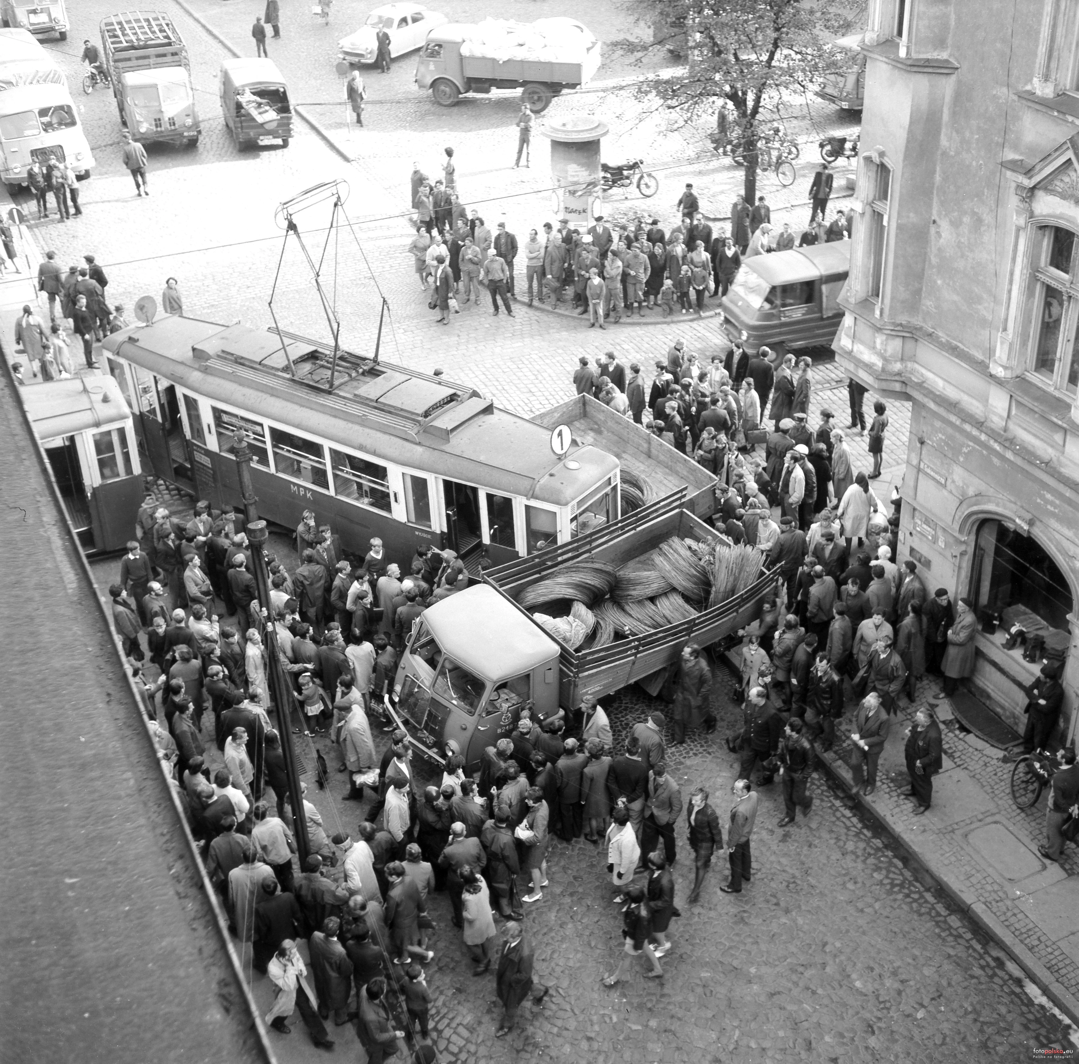 Lata 1970-1971 , Wypadek na skrzyżowaniu ulicy Sukienniczej z Rynkiem Nowomiejskim.Skomentuj zdjęcie |