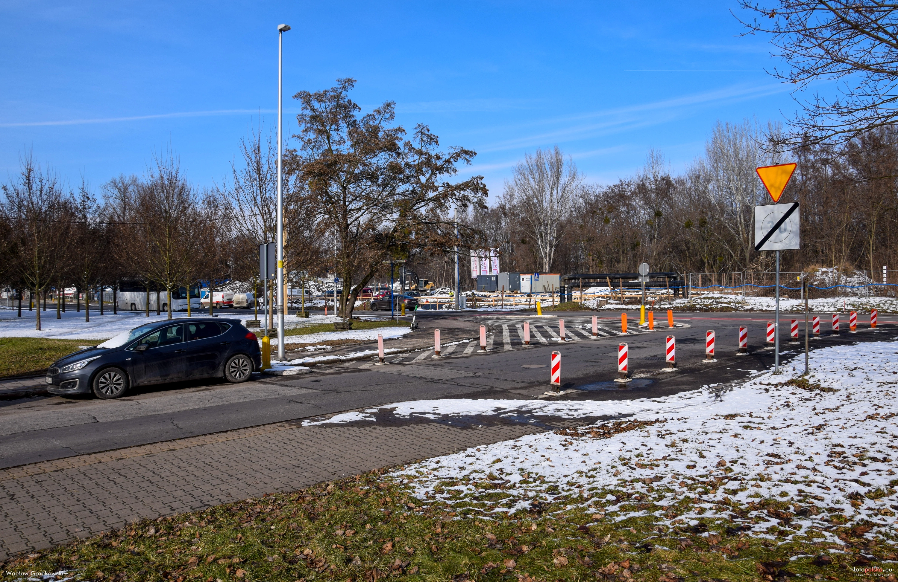 19 lutego 2026 , Szykuje się przebudowa skrzyżowania ulicy Na Grobli z Okólną i Międzyrzecką. Widok z ul. Okólnej. W głębi ul. Na Grobli. Po prawej skręt w ul. Międzyrzecką.