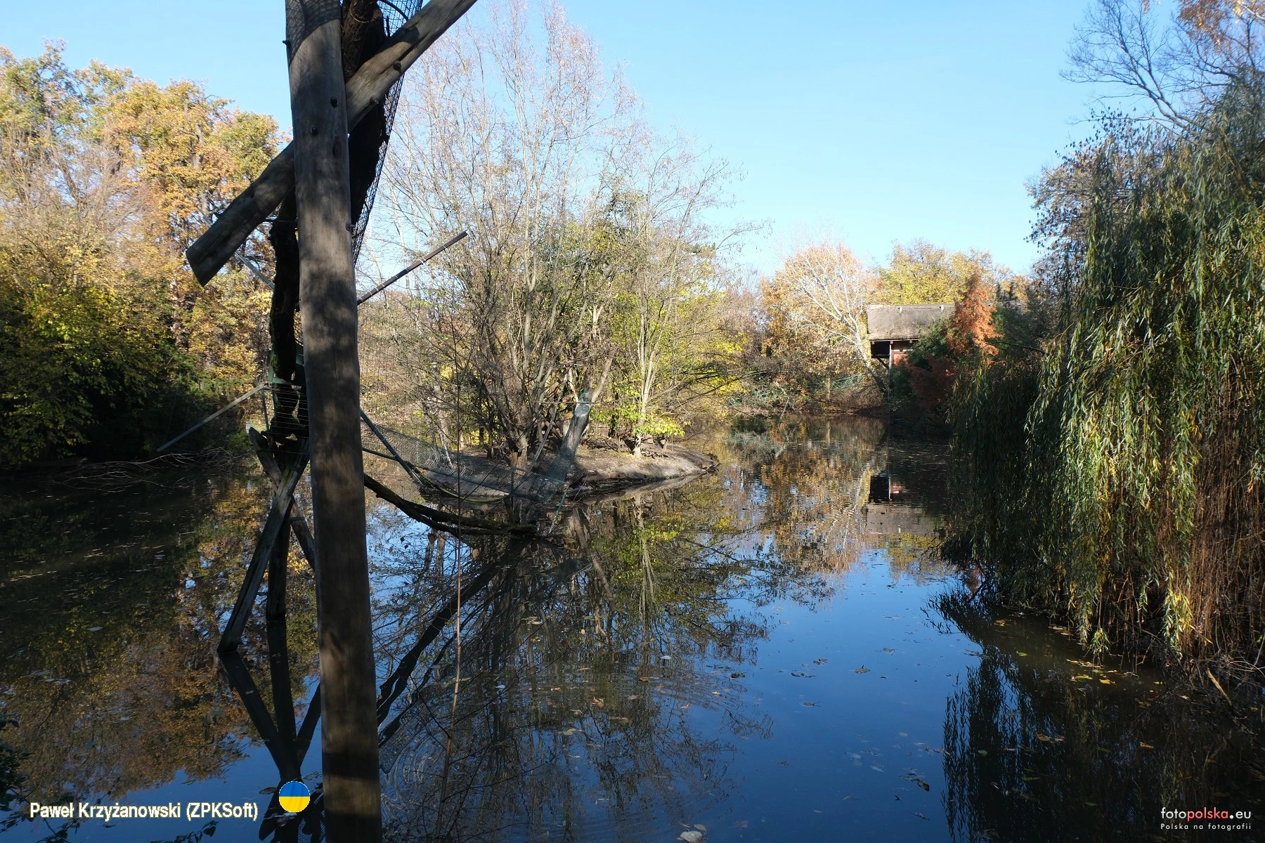 6 listopada 2025 , Konstrukcja po której małpki sajmiri przechodzą na widoczną na stawie wyspę. W głębi po prawej domek (pagoda) gibonów, które też mają swoją "ścieżkę" na kolejną wyspę.Skomentuj zdjęcie |