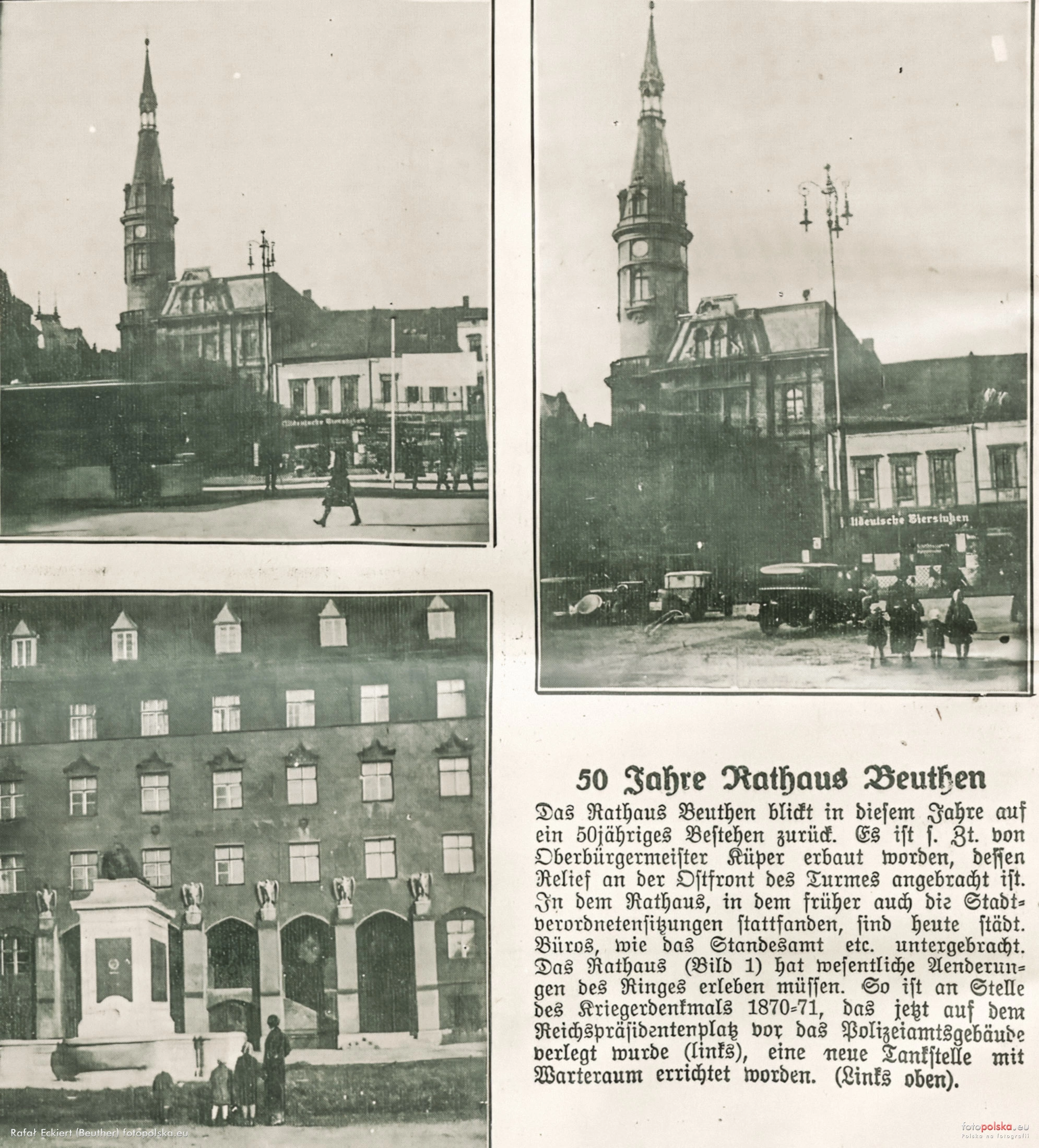 1932 , Beuthen - Das Rathaus blickt in diesen Jahre auf ein 50 jähriges Bestehen zurück Es ist von Oberbürgermeister Küpper erbaut worden dessen Relief an der Ostfront des Türmes angebracht ist. |