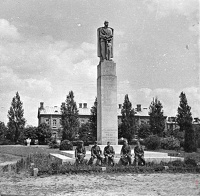 Lata 1939-1942 , Pomnik marszałka Piłsudskiego na terenie koszar ( w miejscu obecnego klubu garnizonowego) Rok 1940. Niemcy rozebrali pomnik dopiero w sierpniu 1942 r, a na postumencie postawili godło ówczesnych Niemiec. (FB Zamość drewniany i zamojskie archiwalia)Skomentuj zdjęcie |