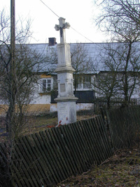 27 stycznia 2001 , Widok krzyża z drogi. Za krzyżem nieistniejący budynek. Obecnie nowy dom z nr. 103.Skomentuj zdjęcie |