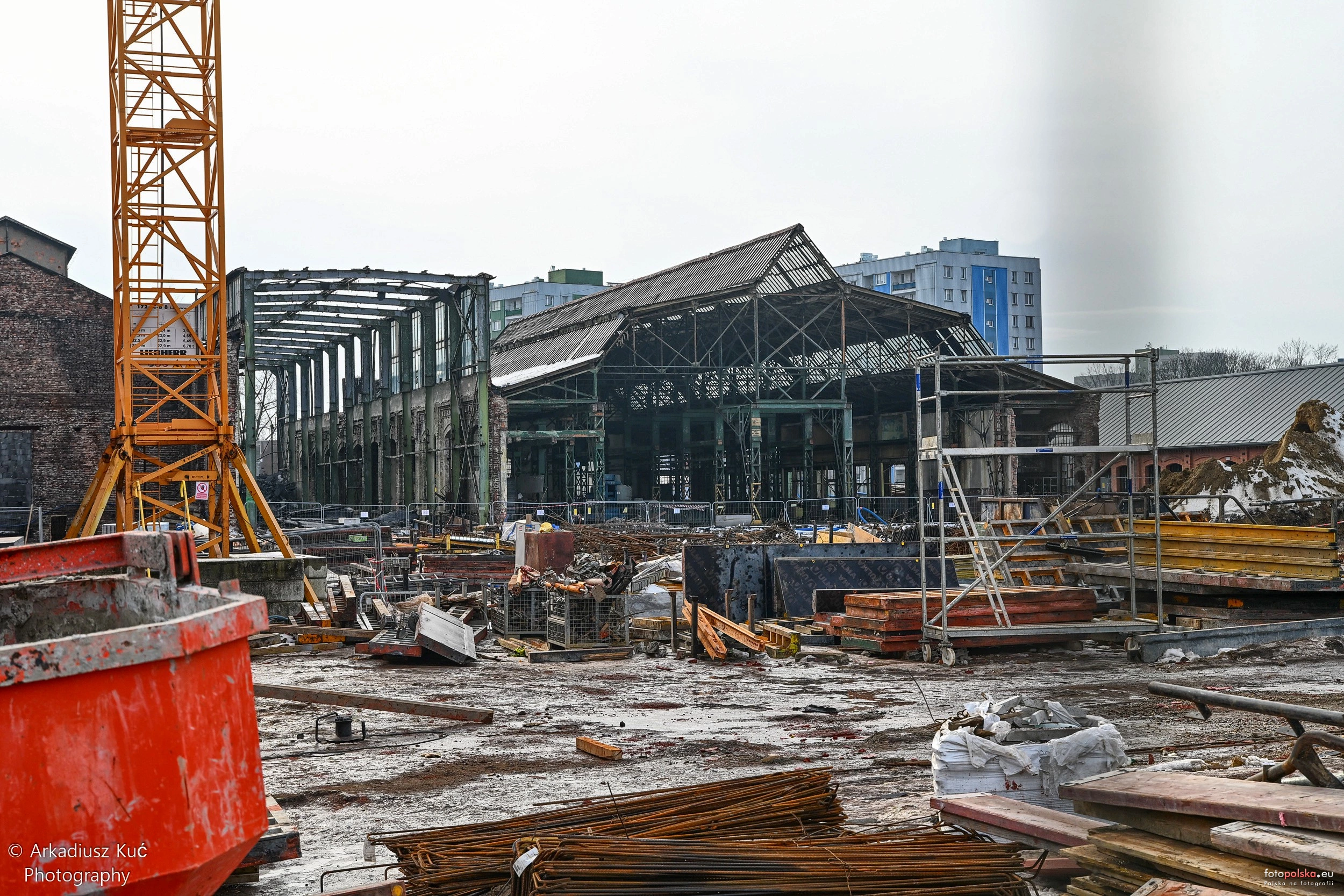 25 stycznia 2026 , Teren dawnej Dąbrowskiej Fabryki Obrabiarek "Defum" - w środkowej części kadru dawna hala fabryczna.