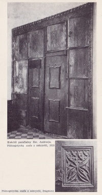 Lata 1964-1965 , Kościół św. Andrzeja - późnogotycka szafa w zakrystii z 1513 r. i fragment dekoracji [Tadeusz Kozaczewski, Środa Śląska, Wrocław 1965].Skomentuj zdjęcie |