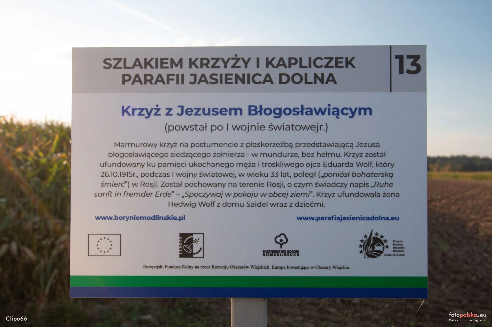 0 pobrań 90 odsłon 0 średnia ocen Poprzednie i następne zdjęcia Clipo66 Obiekty widoczne na zdjęciu Krzyż kamienny więcej zdjęć (4) Zbudowano: 1925 Marmurowy krzyż na postumencie z płaskorzeźbą przedstawiającą Jezusa błogosławiącego siedzącego żołnierza - w mundurze, bez hełmu. Krzyż został ufundowany ku pamięci ukochanego męża i troskliwego ojca Eduarda Wolf, który 26.10.1915 r., podczas I wojny światowej, w wieku 33 lat, poległ (poniósł bohaterską śmierć") w Rosji. Został pochowany na terenie Rosji, o czym świadczy napis „Ruhe sanft in fremder Erde" - "Spoczywaj w pokoju w obcej ziemi". Krzyż ufundowała żona Hedwig Wolf z domu Saidel wraz z dziećmi. |