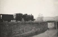 Lata 1960-1965 , Parowóz (tendrzak) ze składem towarowym, zmierzający w stronę stacji w Kowarach, przed wjazdem na wiadukt przerzucony nad dzisiejszą ulicą Karkonoską.