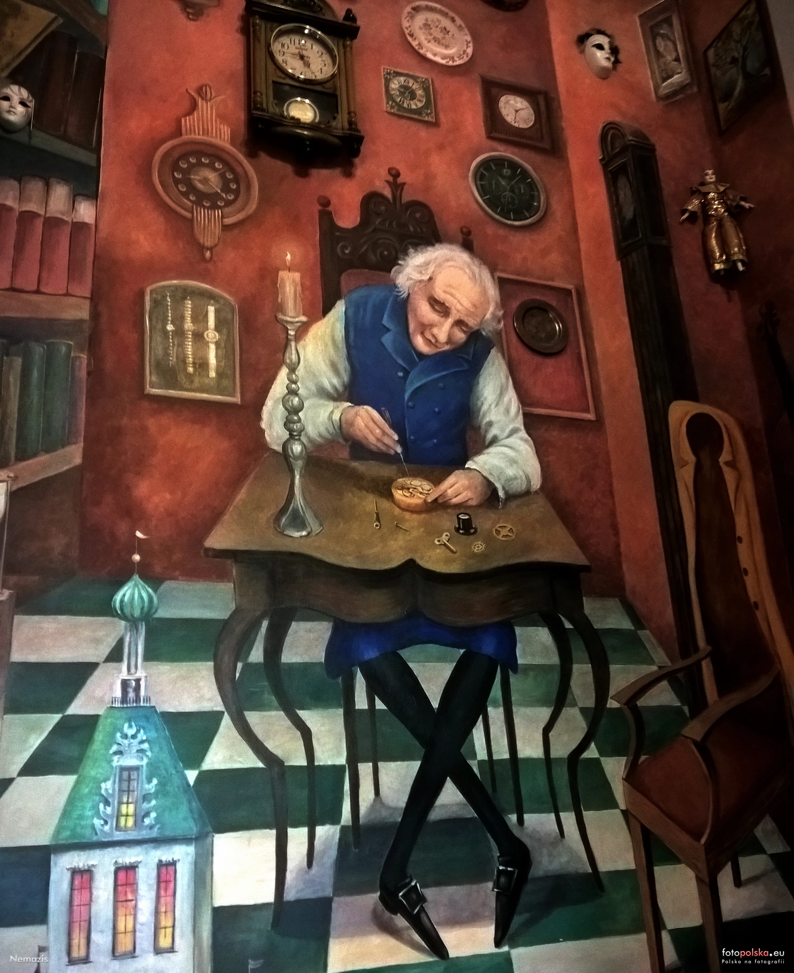 0 pobrań 45 odsłon 0 średnia ocen Poprzednie i następne zdjęcia Nemezis Obiekty widoczne na zdjęciu Lubelskie murale więcej zdjęć (836) Mural "Zegarmistrz" więcej zdjęć (4) Zbudowano: 2022 Mural "Zegarmistrz" znajduje się we wnętrzu budynku Społecznych Szkół im. H. Ch. Andersena w Lublinie ul. Przyjaźni 20. Autorami muralu są Izabela Dybala Salagierska i Krzysztof Dybala. Mural powstał 16.XI.2022r. i zajmuje ścianę czołową półpiętra klatki schodowej we wnętrzu budynku szkoły. Inspiracją malowidła jest zegarmistrz naprawiający zegarek w swoim warsztacie, którego ściany oprócz różnego typu zegarów ozdabiają jeszcze inne przedmioty. Źródło; Eliza S.