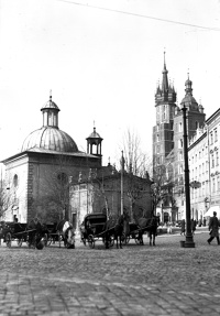 Kościół św. Wojciecha więcej zdjęć (146) Atrakcja turystyczna Zbudowano: XI-XII w. Zabytek: A-79 z dnia 17 lutego 1975 Kościół znajdujący się na Rynku Głównym w Krakowie. Pierwotnie romański, w XVII i XVIII wieku przebudowany w stylu barokowym. Wedle tradycji w tym miejscu miał głosić kazania św. Wojciech, a na pamiątkę tego wydarzenia miał powstać drewniany kościółek. Podczas badań archeologicznych odsłonięto pod obecną budowlą relikty wcześniejszej, murowanej, z przełomu X i XI wieku. Obecna romańska świątynia powstała w 2. połowie XI lub na początku XII wieku. W 1404 roku, dzięki bp Piotrowi Wyszowi Radolińskiemu, kościół został prebendą uniwersytecką. W 1453 wygłaszał tu swoje kazania Jan Kapistran. Na początku XVII w. budowla uległa barokizacji: podwyższono ściany kościoła, całość budowli nakryto kopułą, wytynkowano romańskie mury oraz wybudowano od strony zachodniej nowe wejście. Przebudową kierowali prof. Walenty Fontana oraz ks. Sebastian Mirosz. W 1711 roku dobudowano zakrystię, w 1778 – kaplicę bł. Wincentego Kadłubka. Budowla jest jednonawowa, nakryta eliptyczną kopułą, z prosto zamkniętym prezbiterium. Do nawy przylegają dwie nisze (pastoforia). Od północy do kościoła przylega zakrystia w formie zbliżonej do półkolistej absydy, od południa – prostokątna kaplica Kadłubka. Do wnętrza świątyni prowadzi późnobarokowy portal (2. połowa XVIII). Wyposażenie wnętrza jest barokowe, z ok. połowy XVIII wieku. W ołtarzu głównym znajduje się XVII-wieczny obraz z Matką Bożą Większą. Kopuła jest współcześnie polichromowana przez Eugeniusza Czuhorskiego. W tęczy wisi XV-wieczny krucyfiks. Kaplica ma sklepienie kolebkowe z lunetami, znajduje się w niej obraz Kadłubka przypisywany Szymonowi Czechowiczowi. W podziemiach kościoła znajduje się ekspozycja związana z historią Rynku. (wikipedia) Rynek Główny więcej zdjęć (4837) |