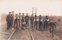 1912 , Prace przy linii kolejowej nr 14 Łódź Kaliska - Tuplice (?) w okolicy Nowej Jabłonnej. Zdjęcie w formie widokówki nadano z Neugabel Kr. Sprottau 12 grudnia 1912 roku.Skomentuj zdjęcie |