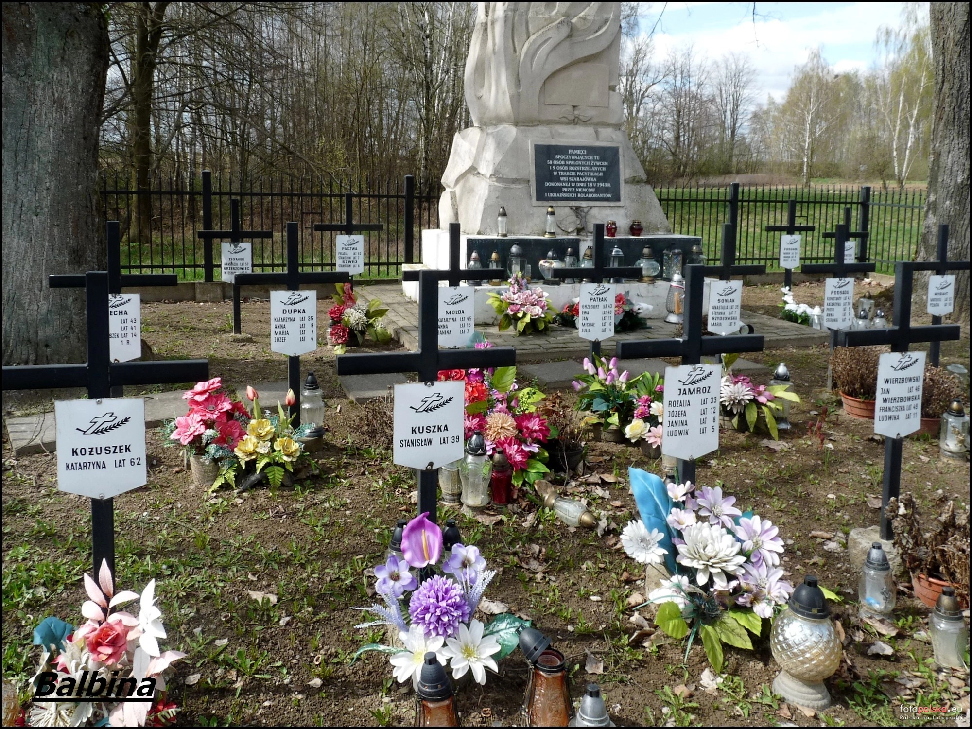 0 pobrań 39 odsłon 6 średnia ocen Poprzednie i następne zdjęcia Balbina Obiekty widoczne na zdjęciu Miejsce pamięci więcej zdjęć (7) Pacyfikacja wsi Szarajówka – masowy mord na ludności cywilnej, połączony z grabieżą i niszczeniem mienia, dokonany przez okupantów niemieckich 18 maja 1943 roku we wsi Szarajówka na Zamojszczyźnie. Dzielnica Szarajówka więcej zdjęć (5) 18 maja 1943 roku Szarajówka została spacyfikowana przez niemiecką żandarmerię wspieraną przez członków ukraińskiej policji pomocniczej z Biłgoraja i Tarnogrodu. Początkowo wszystkich mieszkańców spędzono na główny plac wiejski, gdzie mężczyzn poddano brutalnym przesłuchaniom, usiłując zdobyć informacje na temat działalności partyzantów. Po kilku godzinach całą ludność wpędzono do kilku zabudowań, które następnie podpalono. Ogień podłożono także w pozostałych gospodarstwach. Spłonęło żywcem 58 osób, w tym wiele kobiet i dzieci (według innych źródeł liczba ofiar sięgnęła 67). |