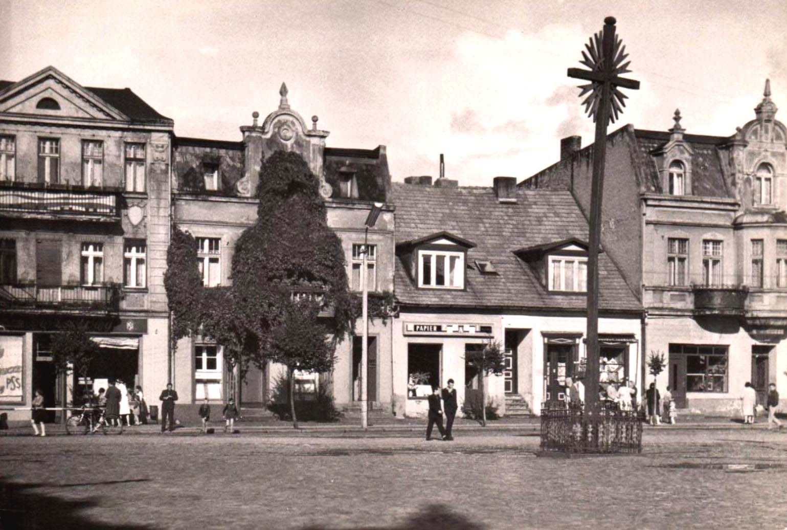 Lata 1960-1961 , Kamienice wschodniej pierzei, na pierwszym planie krzyż - historyczny symbol religijny i patriotyczny; ten widoczny na zdjęciu postawiony został w czerwcu 1945 r. (na miejscu wcześniejszego, usuniętego przez władze niemieckie w listopadzie 1939 r.) i przetrwał cały okres PRL-u; później zamieniono go na mniejszy, a kolejny krzyż postawiono 2 kwietnia 2009 r. nieopodal, w północno-wschodnim rogu rynku i otoczono metalowymi słupkami i łańcuchamiSkomentuj zdjęcie |