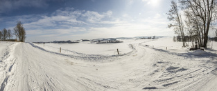 27 lutego 2011 , Panorama spod budynku Łopuchowo 15. Tytułowy krzyz po prawej. Droga na wprost prowadzi do gospodarstwa Łopuchowo 10. W lewo do Udziejka. W dali, z lewej strony kadru, widać charakterystyczną Górę Cisową.Skomentuj zdjęcie |