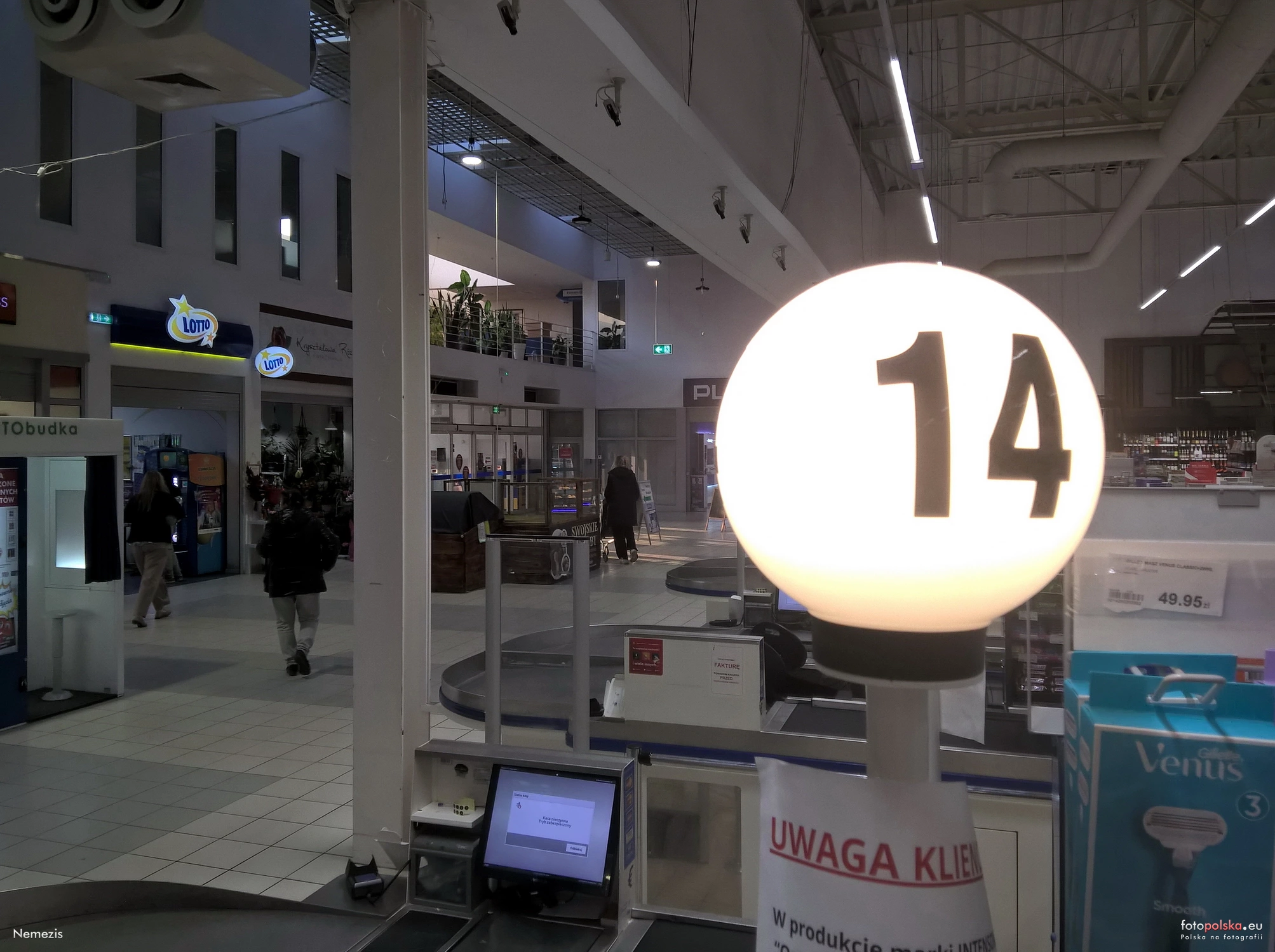 16 marca 2026 , E.Leclerc Turystyczna ul. Turystyczna 1. Widok z oznaczonego (podświetlana biała kula z numerem) nr 14 stanowiska kasowego w kierunku głównego wejścia. Widoczna różnorodna konstrukcja hipermarketu. Typowy układ polskiej galerii handlowej z szerokimi pasażami i antresolą z roślinnością na wyższym poziomie w głębi. W lewym górnym rogu fragment systemu wentylacyjnego. W pobliżu kasy widoczny jest pionowy słup podtrzymujący strop budynku.Skomentuj zdjęcie |