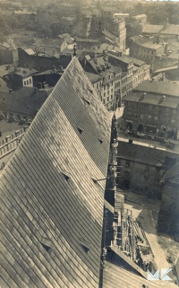 Lata 1926-1933 , Mariacka kalenica - widok z wieży kościoła na południową połać dwuspadowego dachu nad nawą główną, krytego blachą.Skomentuj zdjęcie |