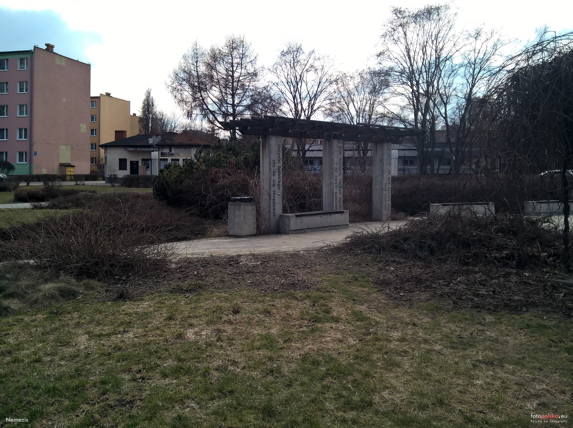 17 marca 2026 , Skwer im. Księdza Jerzego Popiełuszki między ulicami Jesienną i Zimową. Na pierwszym planie pergola.Skomentuj zdjęcie |