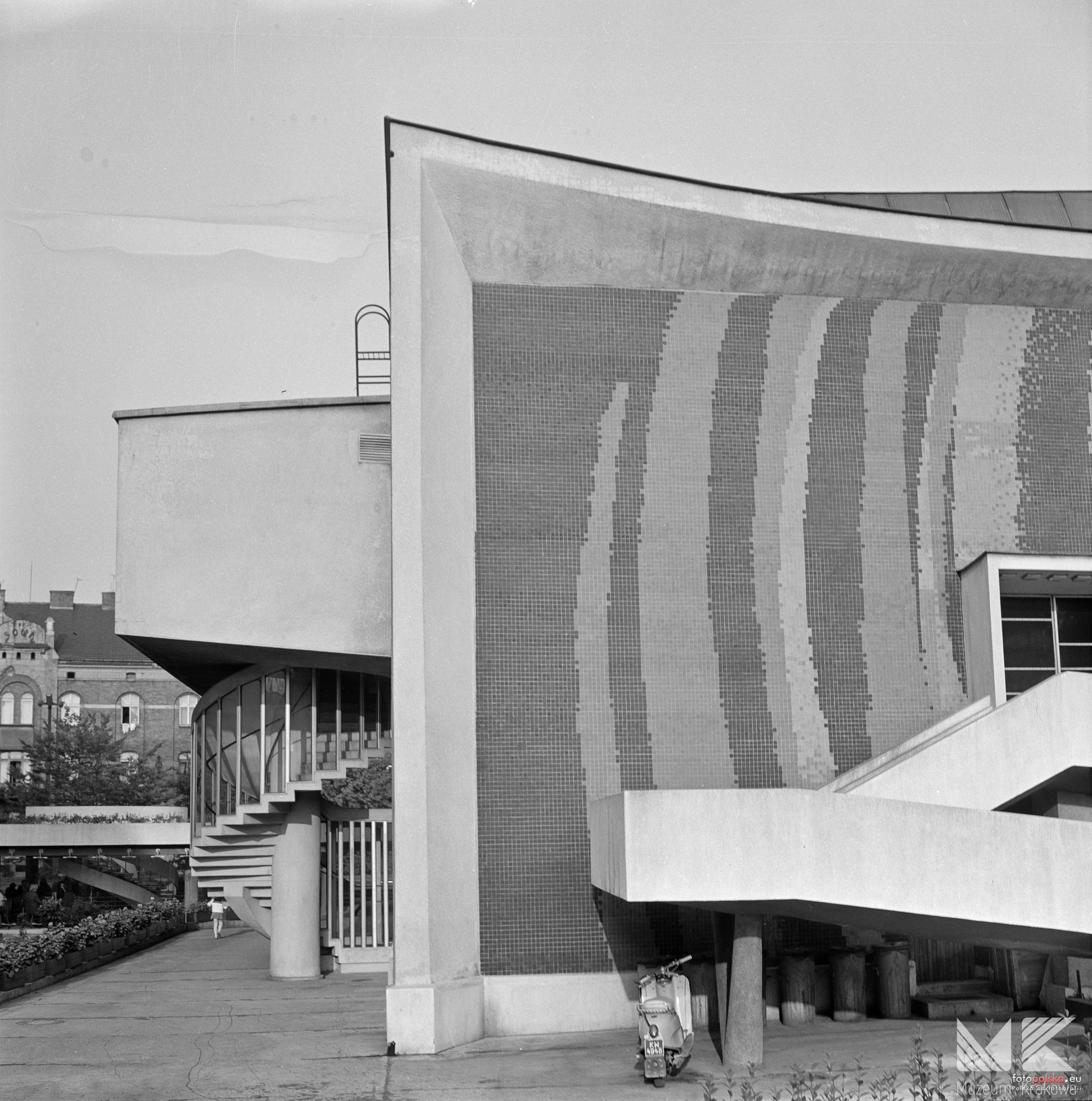 1973 , Widok na tylną elewację Kina Kijów zdobioną mozaiką, od strony zachodniej, w głębi widoczna kamienica Pod Sową przy Al. Krasińskiego 21.Skomentuj zdjęcie |