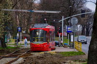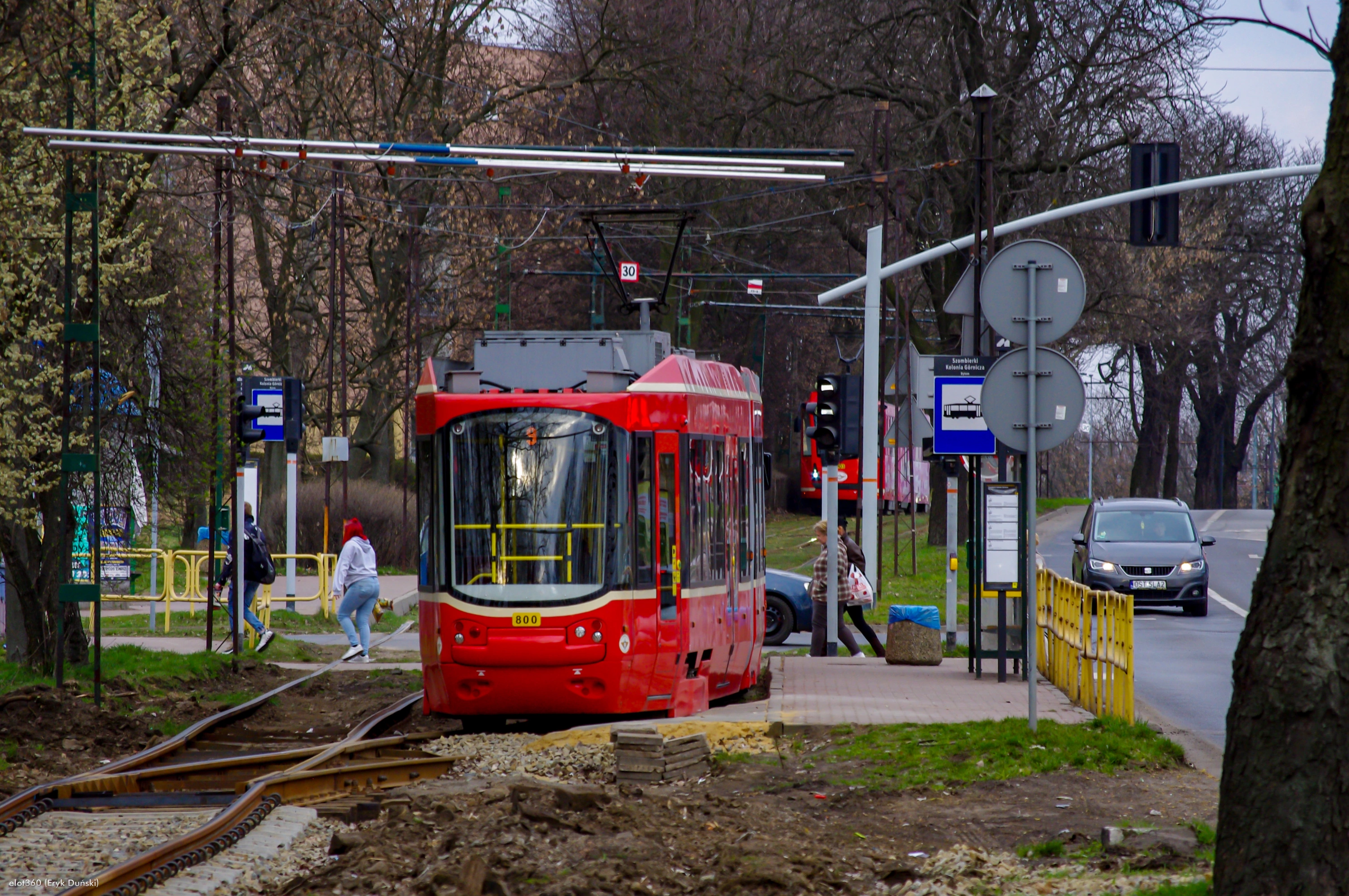 22 marca 2026 , Tramwaj typu 116Ndm podczas postoju na przystanku Szombierki Kolonia Górnicza, w trakcie obsługi linii 9 relacji Chorzów Batory Zajezdnia - Bytom Plac Sikorskiego.