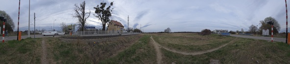 13 kwietnia 2026 , Stacja kolejowa Wrocław Wojnów. Zdjęcie panoramiczne w okolicy skrzyżowania drogowo-kolejowego.Skomentuj zdjęcie