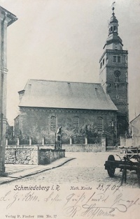 Kościół Najświętszej Maryi Panny więcej zdjęć (81) Atrakcja turystyczna Zbudowano: 1225 Dawniej: Katholische Kirche Zabytek: 135 z 2.01.1950 Zbudowany jest w stylu gotyckim z ozdobną wieżą, w XIV wieku w miejscu drewnianego kościoła św. Wawrzyńca z 1225 roku. Z pierwszej połowy tego stulecia pochodzi obecna zakrystia. W następnej kolejności wzniesiono wieżę, wieloboczne prezbiterium i nawę. We wnętrzu ciekawa polichromia wymalowane przez Jana Lorenza. W nawach kościoła znajdują się liczne figury przedstawiające Marię w białych szatach, Trójcę Świętą. Ołtarz główny wybudowany został w stylu późnobarokowym, tak jak ołtarze Matki Boskiej z Dzieciątkiem, Św. Rodziny, Św. Anny, Św. Krzyża, Św. Aleksego i ołtarz w kaplicy Dzieciątka Jezus. Cennymi zabytkami są dwie wolnostojące figurki: św. Jana Nepomucena i św. Karola Boromeusza. W roku 1934 renowacja wnętrza. W bezpośrednim sąsiedztwie kościoła znajdują się barokowe kaplice, z których najcenniejsze to Kaplica burmistrza Kleinerta z około 1734 roku, oraz Kaplica rodziny Buchwald i Butner datowana na lata 1730-1734. Most z figurą Nepomucena (pl. Franciszkański / Ogrodowa) więcej zdjęć (13) Zbudowano: 1725 Dawniej: Nepomuck Brücke Most kamienny na Jedlicy powstał w 1725 roku. Umieszczono na nim kamienną figurą św. Jana Nepomucena. Most znajduje się między Placem Franciszkańskim a ulicą Ogrodową. Zdjęcia i widokowki z wydawnictwa Paul Fischer & Baldrich Atelier więcej zdjęć (87) Dawniej: Paul Fischer Atelier pl. Franciszkański więcej zdjęć (311) Do 1945 roku w dawnym Schmiedebergu, plac przed kościołem katolickim nie miał swojej odrębnej nazwy, mniej więcej w tym miejscu dawny Markt przechodził w Friedrichstrasse. Uchwałą Rady Miejskiej z 28 lutego 1995 roku wydzielony z ciągu ulicy 1 Maja plac przed kościołem parafialnym w Kowarach zyskał nazwę Placu Franciszkańskiego. Związane to było z obchodzonym 15 września tego samego roku jubileuszem 50-lecia pobytu franciszkanów w Kowarach. 4 września 1998 na niewielkim skwerze na środku placu odsłonięto i poświęcono figurę św. Franciszka z Asyżu. W 2009 roku w związku z remontem sieci kanalizacyjnej figurę przeniesiono na teren przykościelny, a skwer zlikwidowano. (chrzan233) |