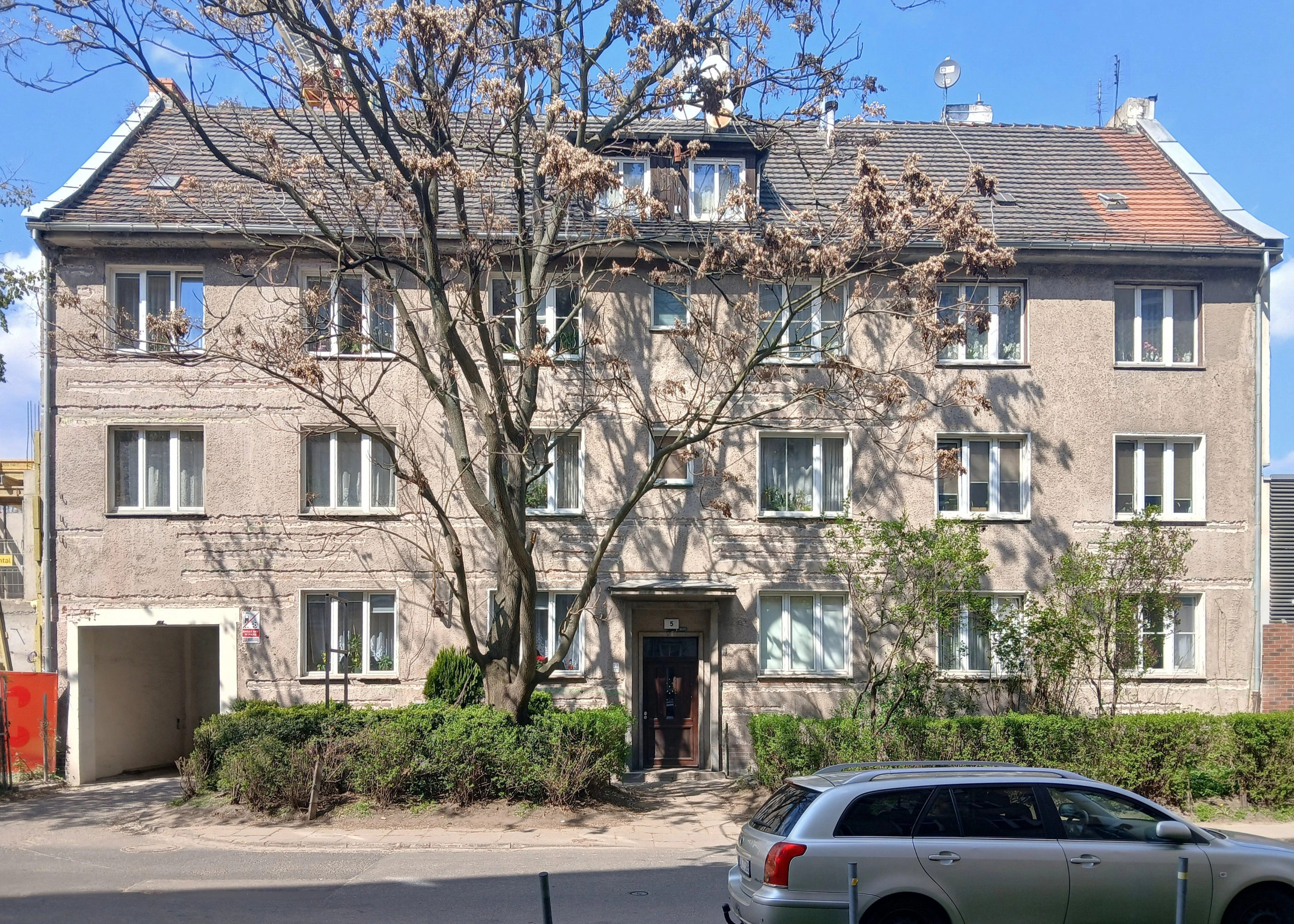 17 kwietnia 2026 , Ustronie 5 za drzewem. Poziome pasy bez tynku kryją zabezpieczenie przed pękaniem murów.Skomentuj zdjęcie