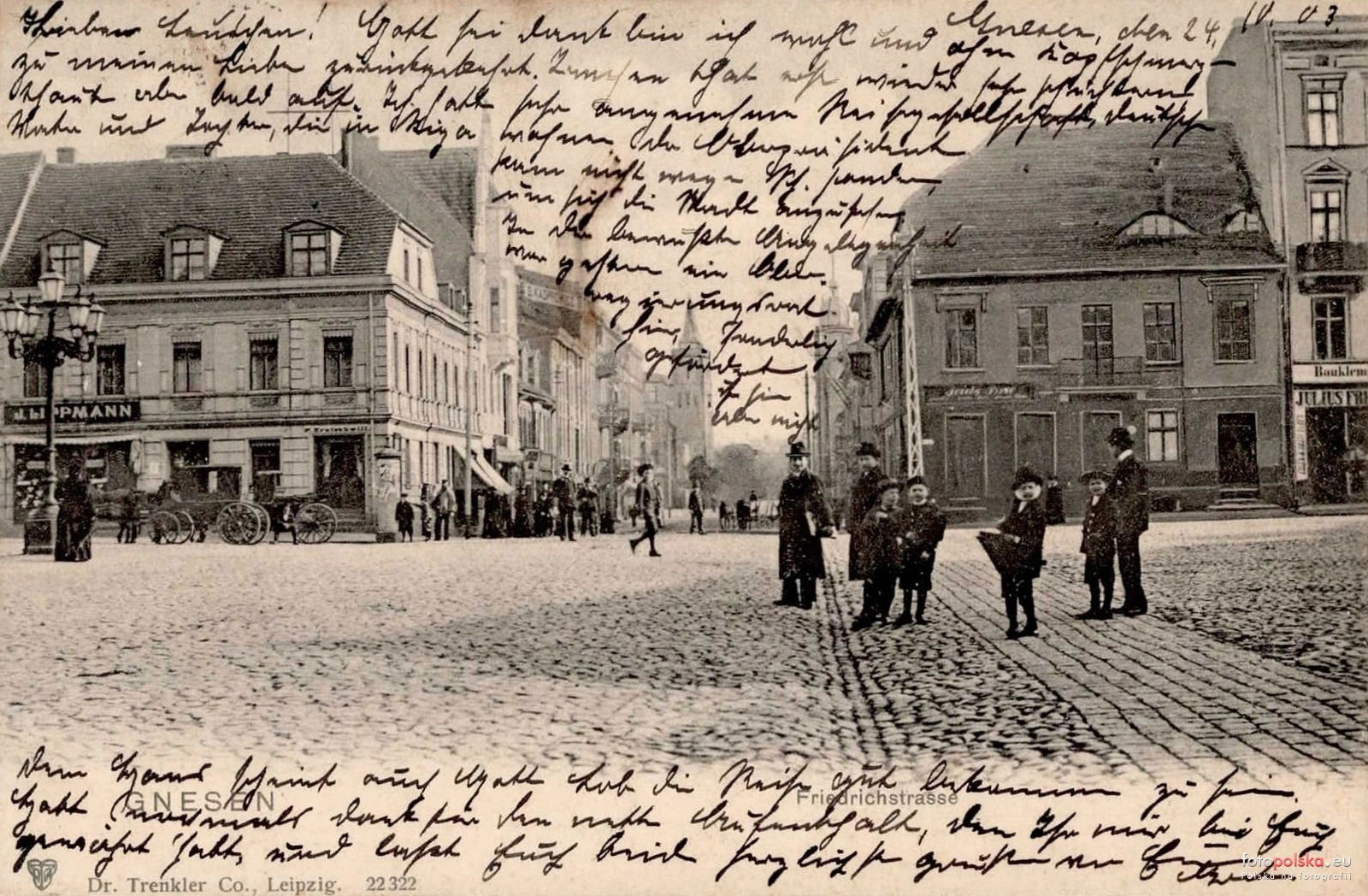 1903 , Wschodnia strona rynku w Gnieźnie, w tle ulica Bolesława Chrobrego. Widokówka z wydawnictwa Dr. Trenklera.Skomentuj zdjęcie |