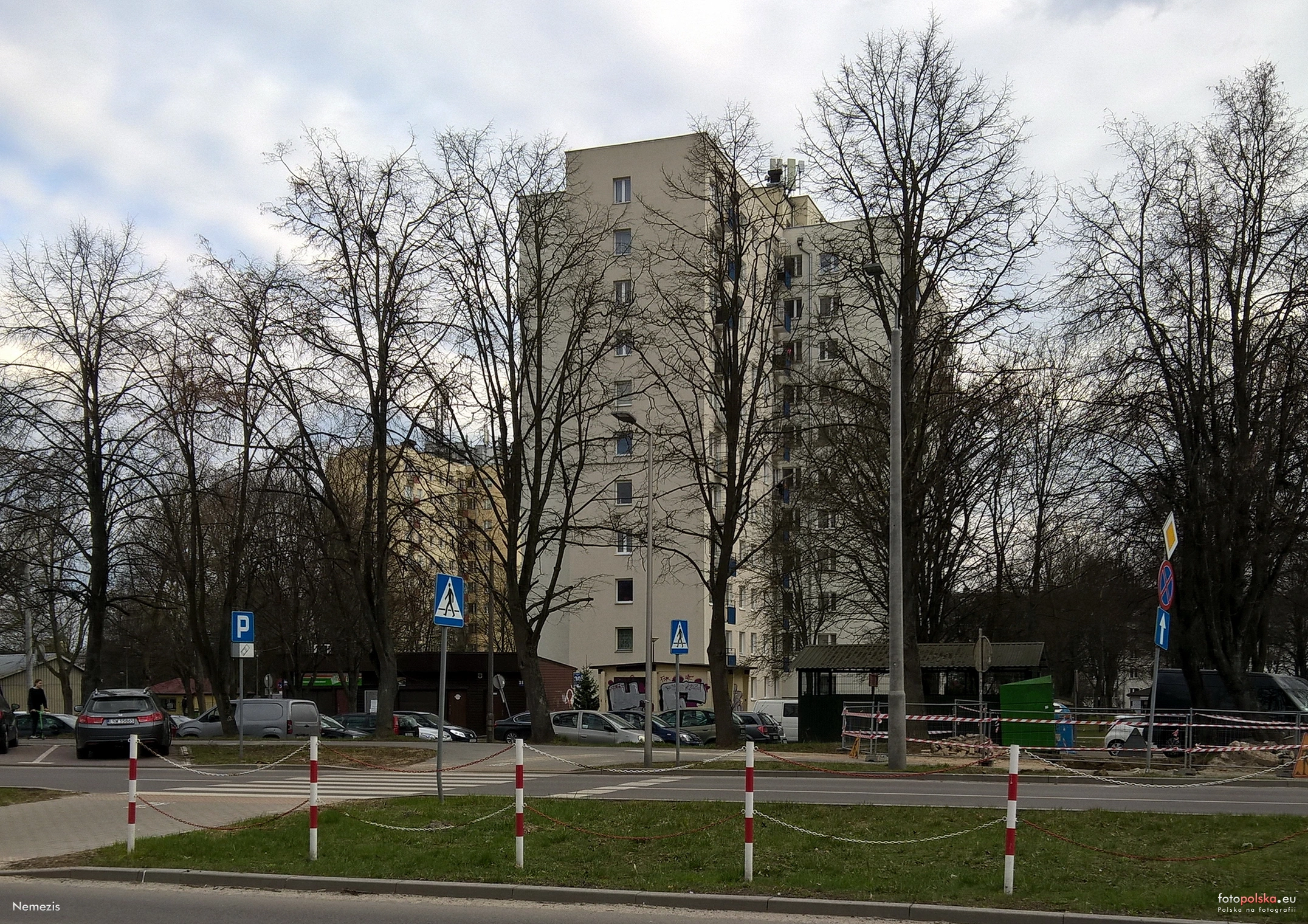 29 marca 2026 , Widok z ul. Racławickiej, w głębi wieżowiec mieszkalny ul. Racławicka 30. |